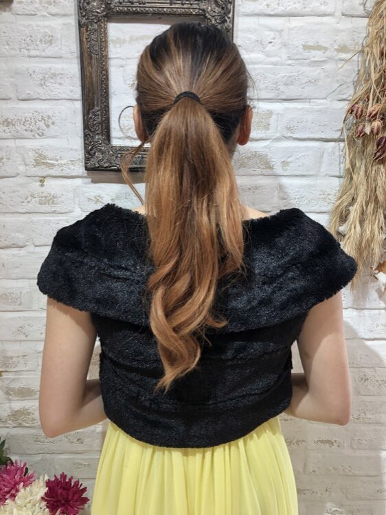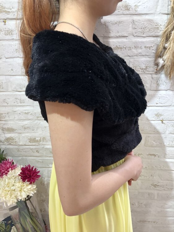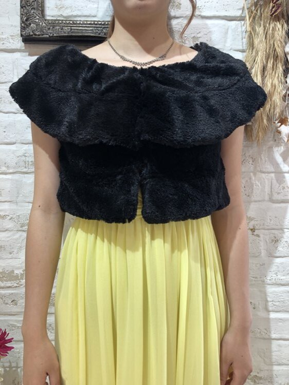 裏地のドット柄がポイントのフェイクファーケープ風ボレロ。アームホールがあるのでずれ落ちる心配もありません。正面にホック2段付き。エレガントなやや光沢感のある柔らかい毛並みはコーディネートをワンランク格上げしてくれます。フェイクファーですがふわふわの質感をお楽しみ下さい。クリスマスパーティーや謝恩会、成人式、お食事会、女子会など秋冬の華やかなパーティシーンにおすすめです。サイズは目安になりますので必ず表記している実寸サイズをご確認ください。