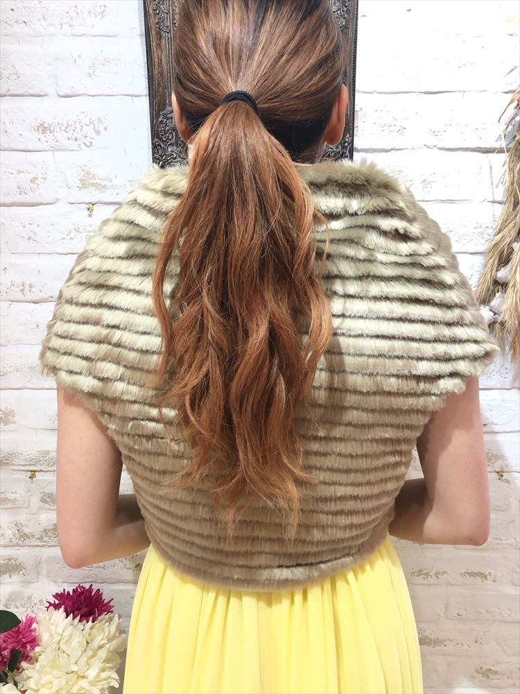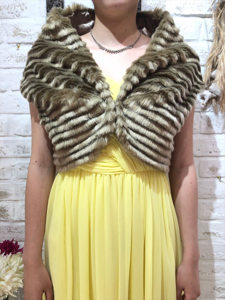 羽織るだけでシーズンムードあふれるフェイクファーケープ風ボレロです。一見、ケープ型のデザインですがアームホールがあるのでずれ落ちる心配もなく安心してイベントが楽しめる1着です。正面についているホックを留めてその上にブローチなどをつけても素敵です。おしゃれなブラウンカラー。可愛い系にもきれいめ系にもあわせやすいデザインです。クリスマスパーティーや謝恩会、成人式、お食事会、女子会など秋冬の華やかなパーティシーンにおすすめです。サイズは目安になりますので必ず表記している実寸サイズをご確認ください。