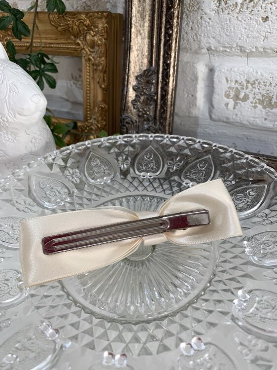 結婚式参列・発表会・Xmas、ハロウィーンパーティーなど華やかなシーンにおすすめのキッズ用ヘッドアクセサリーです。清楚なホワイトカラーのリボン風バレッタ。普通のリボンとはひと味ちがう左右アシンメトリーなデザインはおしゃれ度をワンランク上げてくれます。上品なイメージにされたい方にオススメの1点になります。