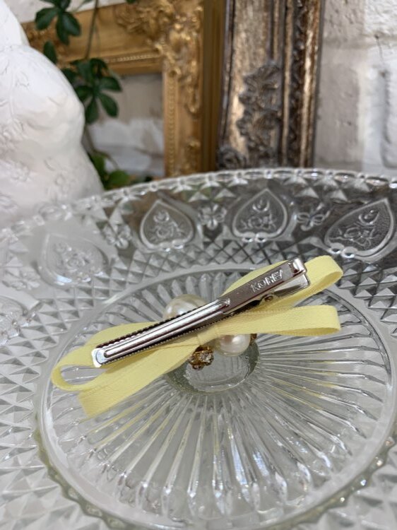 結婚式参列・発表会・Xmas、ハロウィーンパーティーなど華やかなシーンにおすすめのキッズ用ヘッドアクセサリーです。リボンにパール付き。小さめサイズなので幼いお子様にもバランス良くつけて頂けます。後ろにはクリップがついておりますのでヘアに留めるだけでかんたんに着用して頂けます。サイドやヘア結び目などにおすすめです。色違いでピンク、イエロー、ホワイト、グリーン有り。