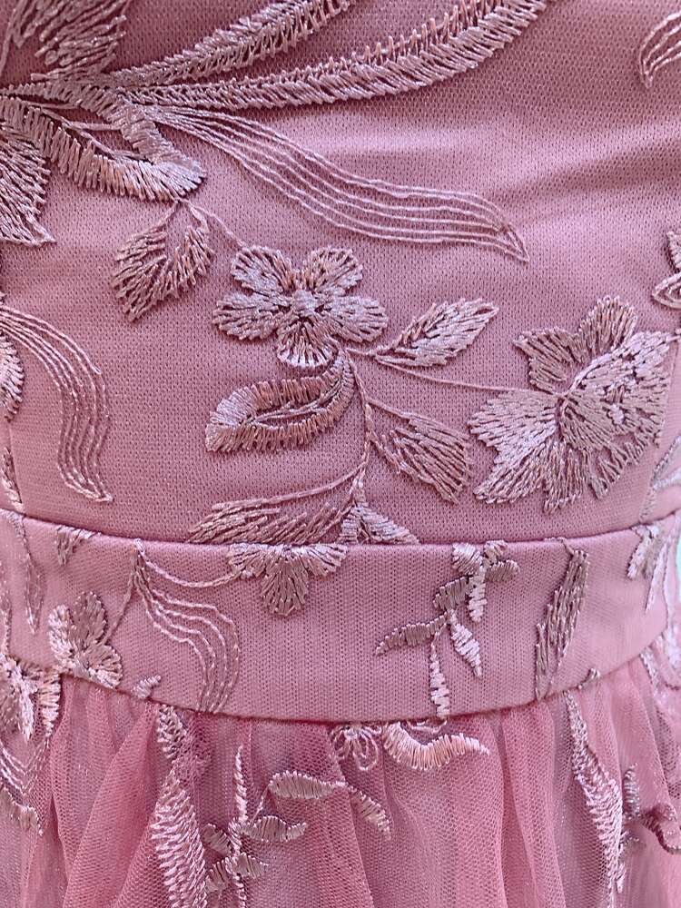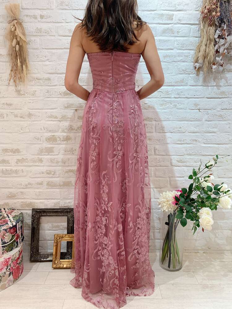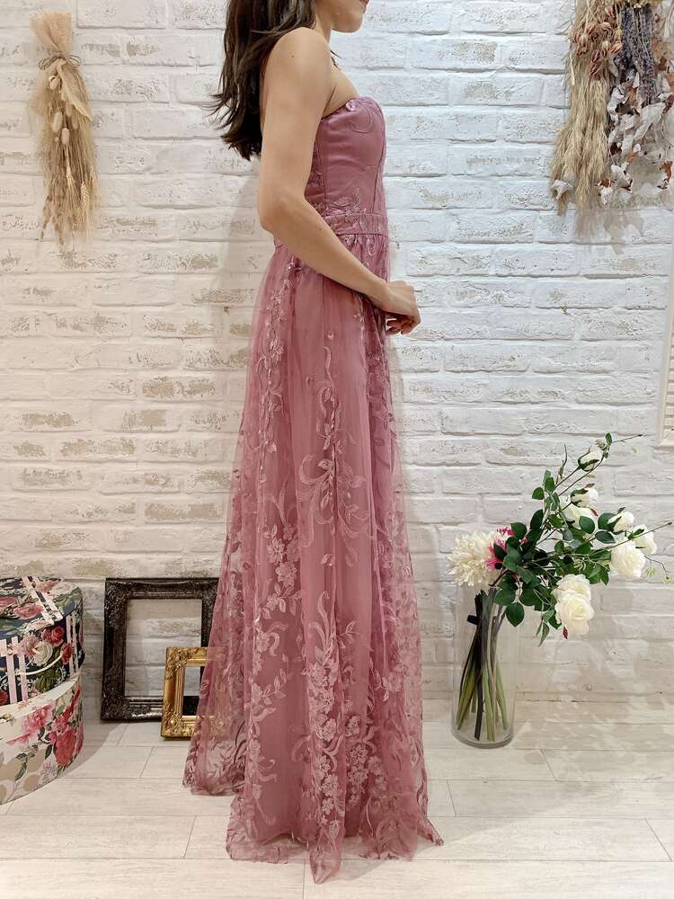 モーブピンクカラーが魅力的なロングベアドレスです。生地の上にチュールが重なっており、花柄の刺繍が施されているので華やかな印象。バストカップはやや浅めの作りで胸元やお顔まわりをすっきりと見せてくれます。大きめのネックレスやイヤリング・ピアスをコーディネートしても素敵です。花嫁様の2次会や撮影、演奏会、コンテスト、華やかなパーティーシーンなどにぴったりの1着です。きらきらのアクセサリーをつけてゴージャス系に、花かんむりなどでナチュラル系にとお好みで雰囲気が変えられるドレスです。