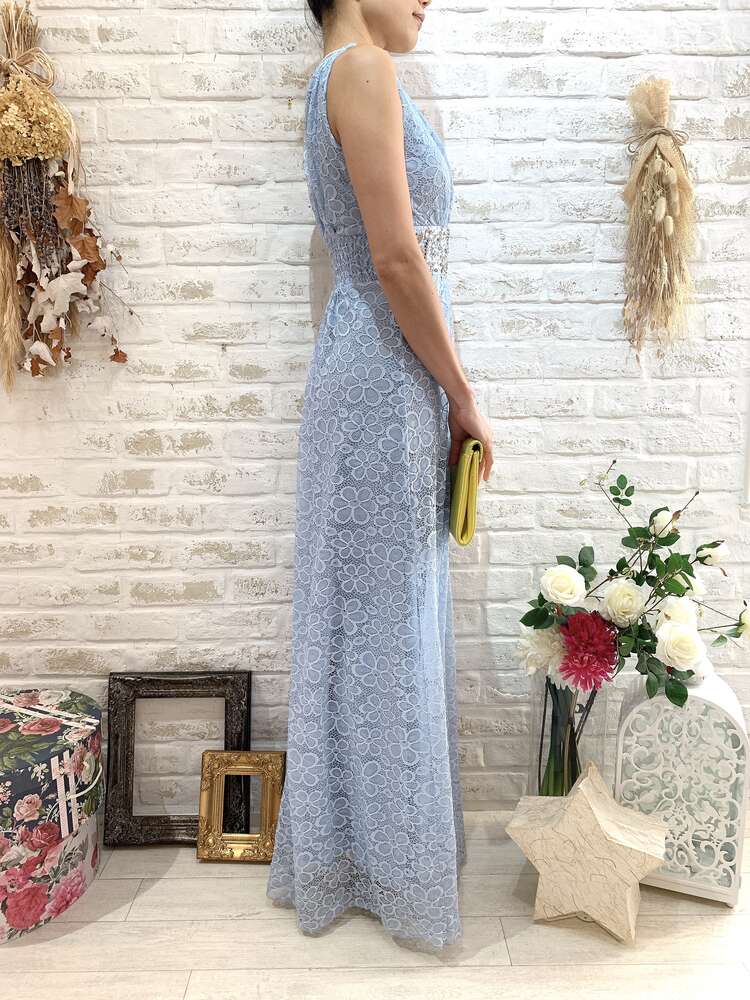 水色ウエストビジュー花柄全レース肩有ロングドレス