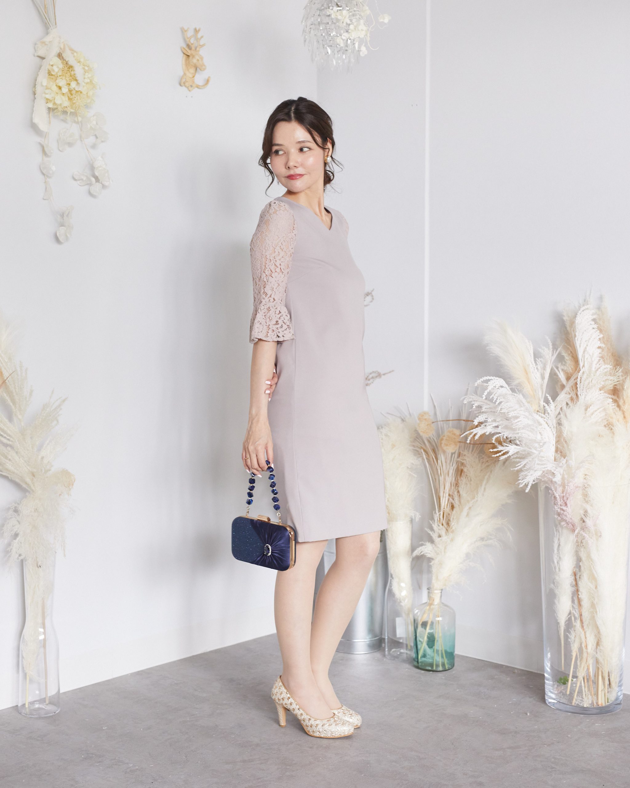 上品なグレージュカラーの袖有りドレスです。人気の袖付きドレスでお袖はレースになっておりほどよい色気と抜け感をプラスしてくれます。身頃はシンプルでマットなさらりとした生地。ややタイトめなシルエットですっきりとした印象です。結婚式参列やお食事会、デート、謝恩会などにおすすめの1着です。サイズ表記はXSで通常5号~7号くらいの方におすすめです。3号の方もゆったりめに着用して頂けるかと思います。(目安になりますので必ず記載の実寸サイズをご確認ください。)お袖がレース素材になりますのでバッグのショルダーチェーンなどひっかけてしまうと取れなくなる場合もございます。バッグはチェーンを使用せずお手持ちになるようにお願い致します。