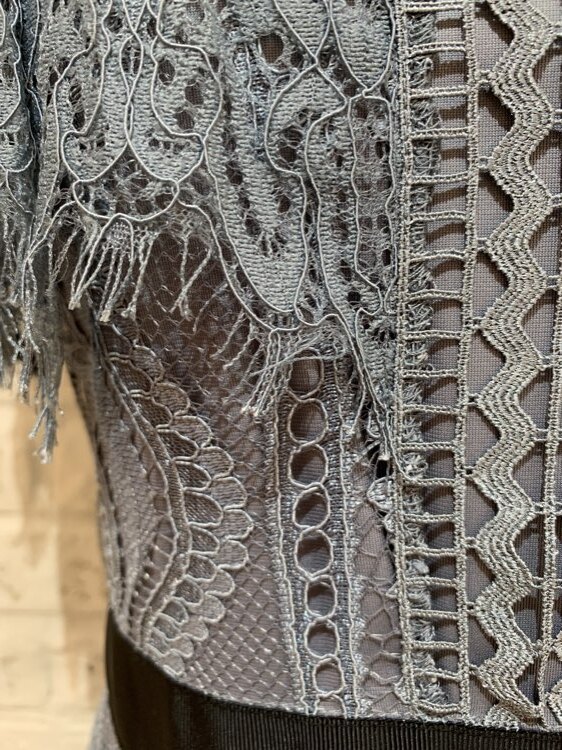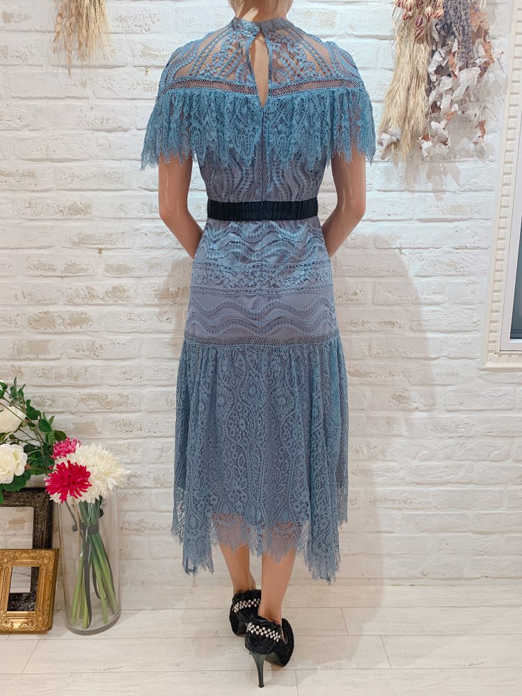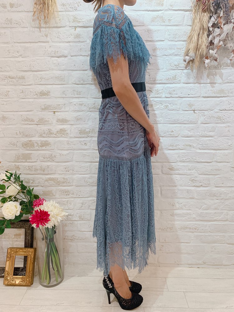 人気のSNIDEL(スナイデル)の繊細なレースが魅力的なサックスブルーカラードレスです。少しスモーキーなサックスブルーはおしゃれな印象。ブラックのウエストラインで全体をしめてくれます。繊細なレースを数種類使っており上品で気品があふれる1着です。着丈も長めですので身長が高い方にもエレガントに着用して頂けます。ネックラインは詰まったデザインになりますのでネックレスはあえてつけずに大ぶりのイヤリング・ピアスをコーディネートするのも素敵です。非常に繊細なレースになりますのでバッグのショルダーチェーンなどひっかけてしまうと取れなくなる場合もございます。バッグはチェーンを使用せずお手持ちになるようにお願い致します。