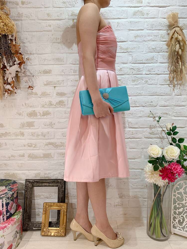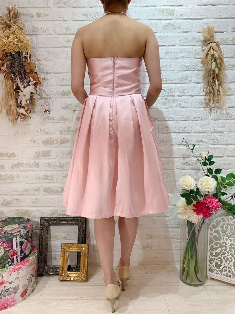 ハリ感のあるやわらかいピンクカラーベアドレスです。やや光沢感のあるハリのある素材で上品な雰囲気の1着。バスト部分は異素材でななめに交差するデザインになっており全体がのっぺり見えずメリハリ感が出ます。サイズ違い、色違いもございますのでブライズメイドにもおすすめのドレスです。伸縮性はないので記載の実寸サイズを必ずご確認ください。謝恩会、女子会、各種パーティーなどにおすすめの1着です。結婚式参列などお呼ばれシーンにはボレロやストールなど羽織ると露出もおさえられて◎です。