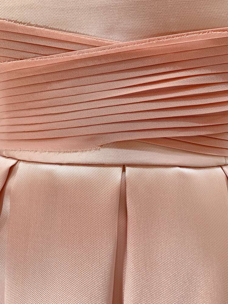 ハリ感のあるやわらかいピンクカラーベアドレスです。やや光沢感のあるハリのある素材で上品な雰囲気の1着。バスト部分は異素材でななめに交差するデザインになっており全体がのっぺり見えずメリハリ感が出ます。サイズ違い、色違いもございますのでブライズメイドにもおすすめのドレスです。伸縮性はないので記載の実寸サイズを必ずご確認ください。謝恩会、女子会、各種パーティーなどにおすすめの1着です。結婚式参列などお呼ばれシーンにはボレロやストールなど羽織ると露出もおさえられて◎です。