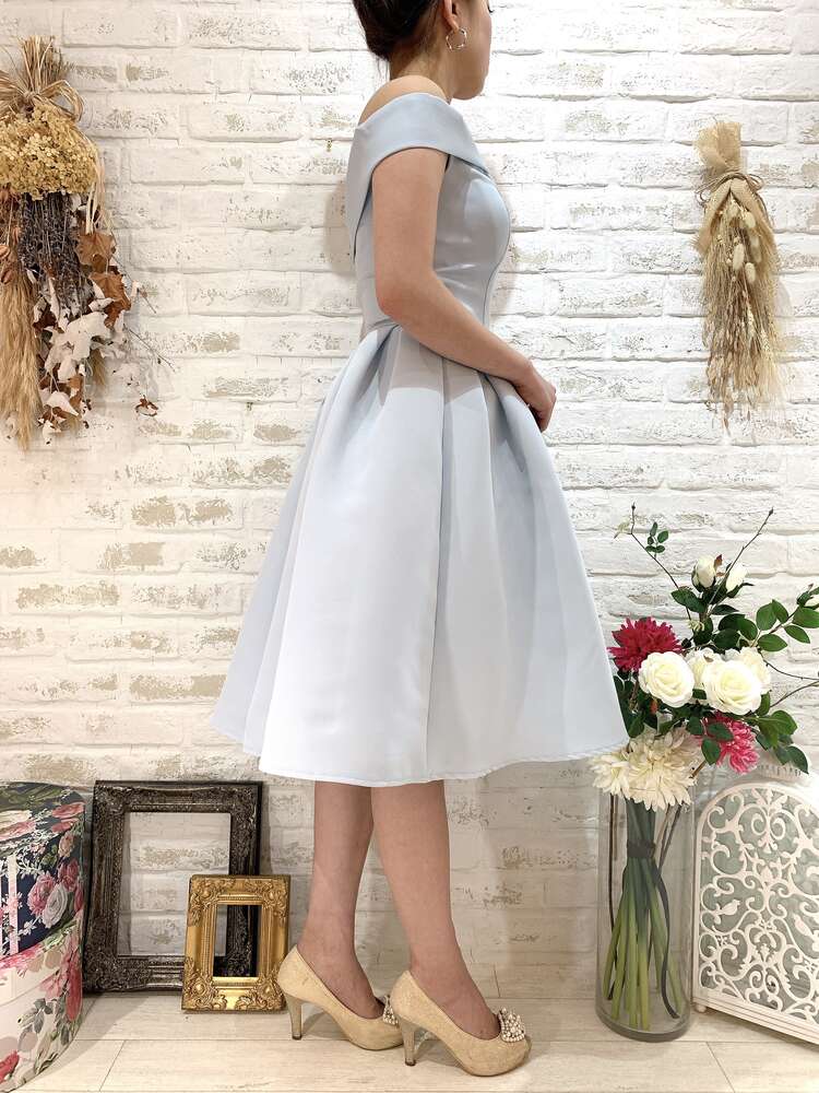 世界的に人気のあるchichilondon(チチロンドン)のさわやかなペールブルーのオフショルダードレスです。ボリュームが出るスカートがエレガントで魅力的な1着です。オフショルダー部分には内側にゴムがついていて腕からずれ落ちにくいデザインになっています。光沢感のないマットな生地になります。バスト部分にうすいパッド付き。お食事会、謝恩会、女子会、各種パーティーにおすすめの1着です。結婚式参列などのお呼ばれシーンにはストールなど羽織ると露出もおさえられて◎です。