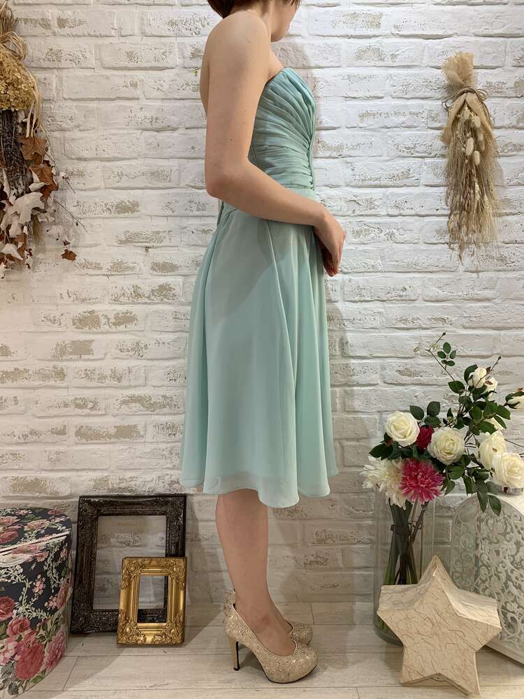 ティファニーブルーカラーが爽やかなベアドレスです。さらりとしたシフォン素材で揺れるスカートが魅力的です。バスト部分はハートカットになっており首元、お顔周りをすっきりと見せてくれます。背中部分も後ろ下がりなデザインですっきりと。バスト部分はタックが交差したデザインになっており無地のドレスの表情を変化させスタイリッシュに仕上げています。サイズ違いあり。色違いでピンクカラー有り。ブライズメイドにもおすすめのドレスです。海外やリゾートでの結婚式や女子会、謝恩会などにもおすすめ。結婚式参列などお呼ばれシーンにはボレロやストールなど羽織り物を羽織って頂くと露出感も安心です。