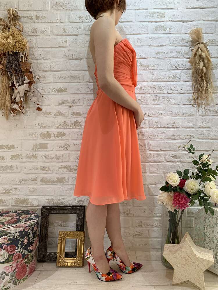 鮮やかなコーラルピンクカラーのベアドレスです。さらりとしたシフォン素材で揺れるスカートが魅力的です。バスト部分はハートカットになっており首元、お顔周りをすっきりと見せてくれます。背中部分も後ろ下がりなデザインですっきりと。バスト部分はタックが交差したデザインになっており無地のドレスの表情を変化させスタイリッシュに仕上げています。サイズ違いあり。色違いでブルーグリーン有り。ブライズメイドにもおすすめのドレスです。海外やリゾートでの結婚式や女子会、謝恩会などにもおすすめ。結婚式参列などお呼ばれシーンにはボレロやストールなど羽織り物を羽織って頂くと露出感も安心です。