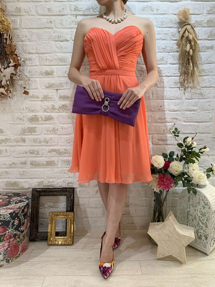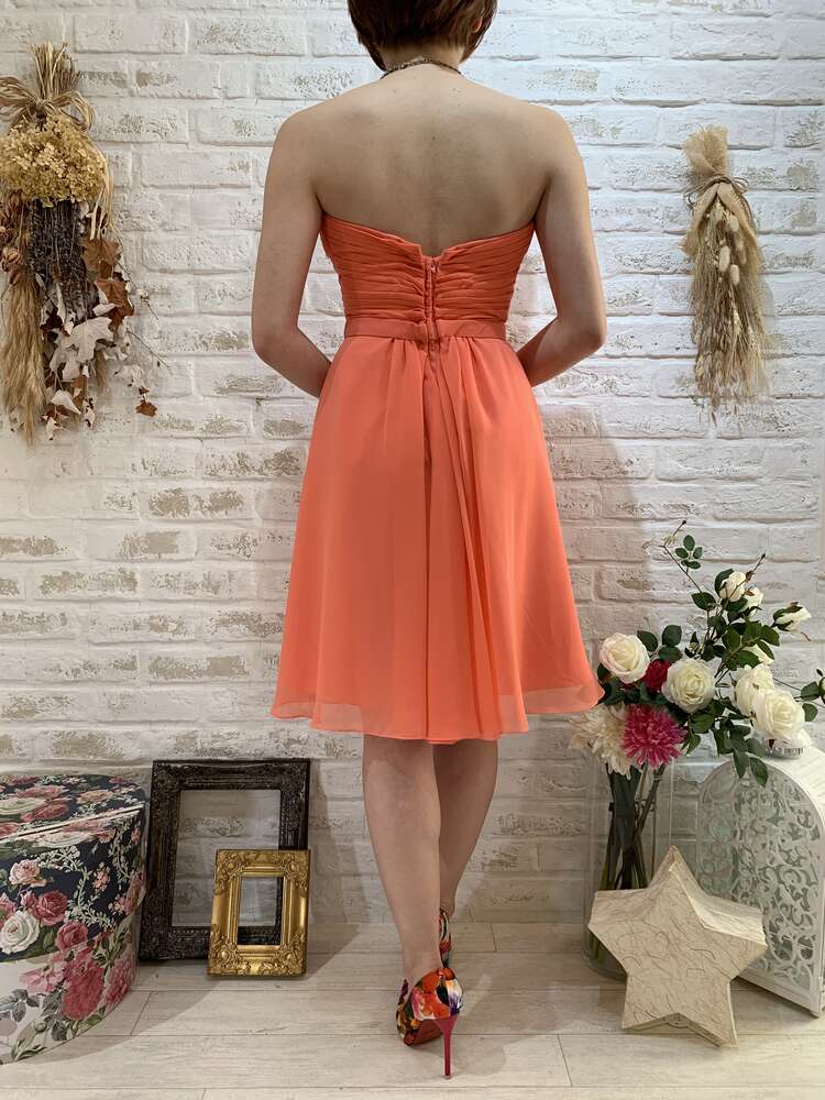 鮮やかなコーラルピンクカラーのベアドレスです。さらりとしたシフォン素材で揺れるスカートが魅力的です。バスト部分はハートカットになっており首元、お顔周りをすっきりと見せてくれます。背中部分も後ろ下がりなデザインですっきりと。バスト部分はタックが交差したデザインになっており無地のドレスの表情を変化させスタイリッシュに仕上げています。サイズ違いあり。色違いでブルーグリーン有り。ブライズメイドにもおすすめのドレスです。海外やリゾートでの結婚式や女子会、謝恩会などにもおすすめ。結婚式参列などお呼ばれシーンにはボレロやストールなど羽織り物を羽織って頂くと露出感も安心です。