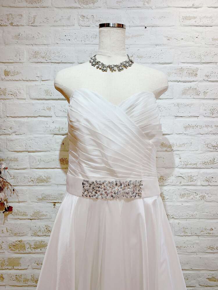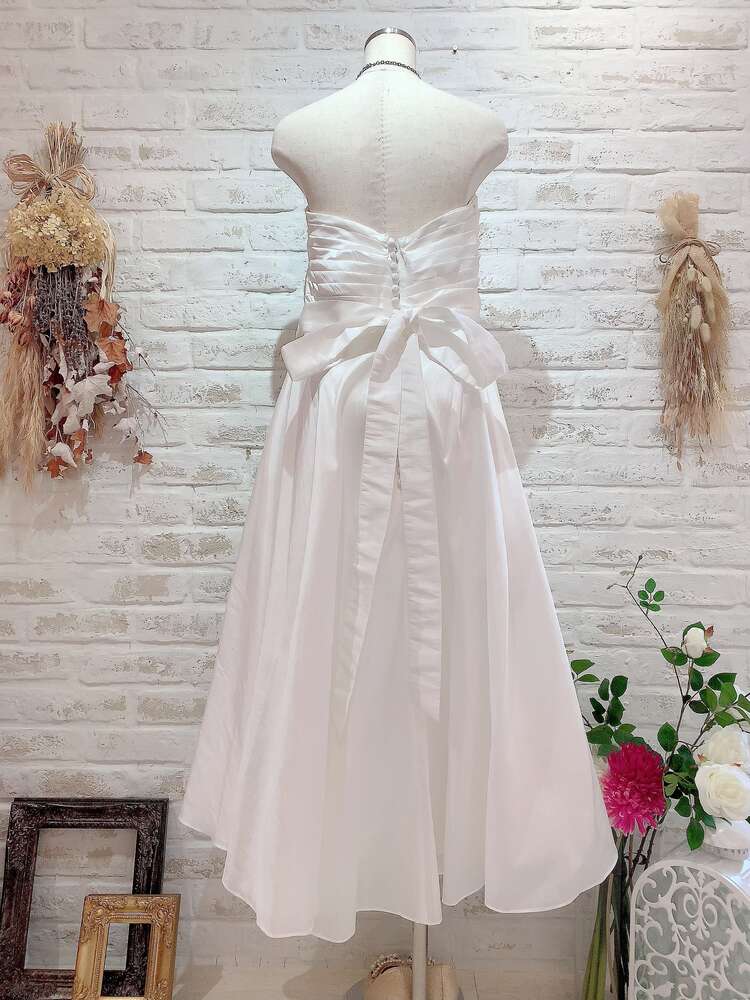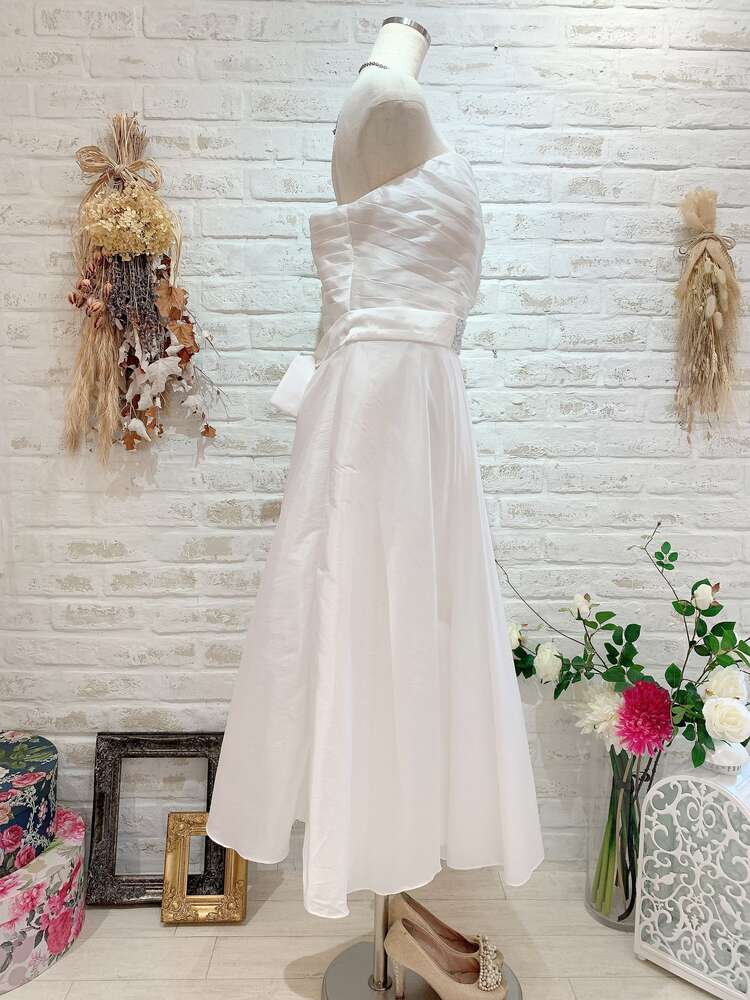 ウエストビジューがポイントのホワイトカラー足首丈ベアドレスです。花嫁様2次会や撮影などにおすすめのホワイトカラードレス。黄みがない真っ白な純白カラーです。やや光沢感がありハリのある素材で上品でクラシカルな雰囲気。ウエストのリボンを後ろで蝶々結びすれば可愛らしいポイントになります。上半身はプリーツがはいっておりのっぺり見えずに全体にメリハリ感が出るデザインです。伸縮性無し。背中部分はファスナーで着脱するタイプになっており、飾りボタンがついています。大きめサイズのドレスです。(サイズは目安になりますので必ず記載の実寸サイズをご確認ください。)