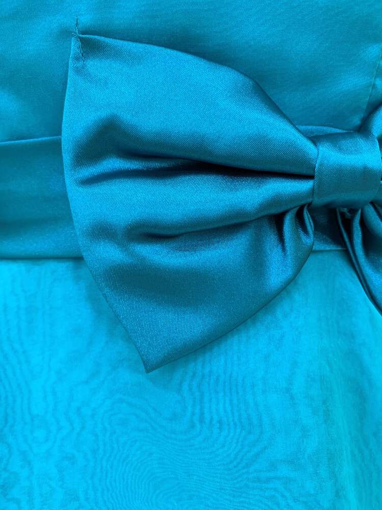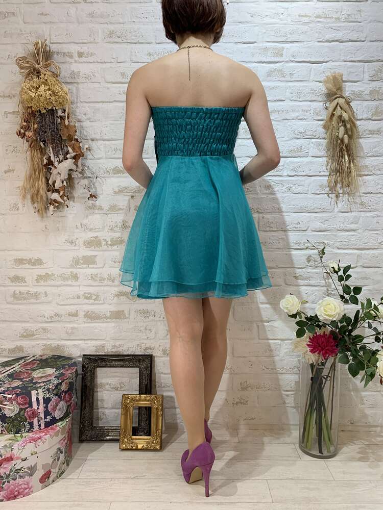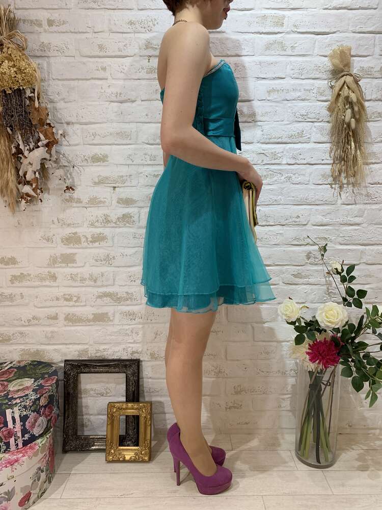 キュートなウエストリボンがポイントのグリーンカラーミニベアドレスです。フロントについた大きめのリボンが可愛らしさを与えつつウエストをマークしてスタイルアップ効果も期待できそうです。デコルテ部分についたストーンも華やかさをプラスしてくれます。着丈は短めなので身長が低い方もバランス良く着用して頂けます。背中部分はシャーリングゴムで伸縮性有り。結婚式参列、女子会、謝恩会などにもおすすめ。結婚式参列などお呼ばれシーンにはボレロやストールなど羽織り物を羽織って頂くと露出感も安心です。生地に若干傷がございます。(画像参照)