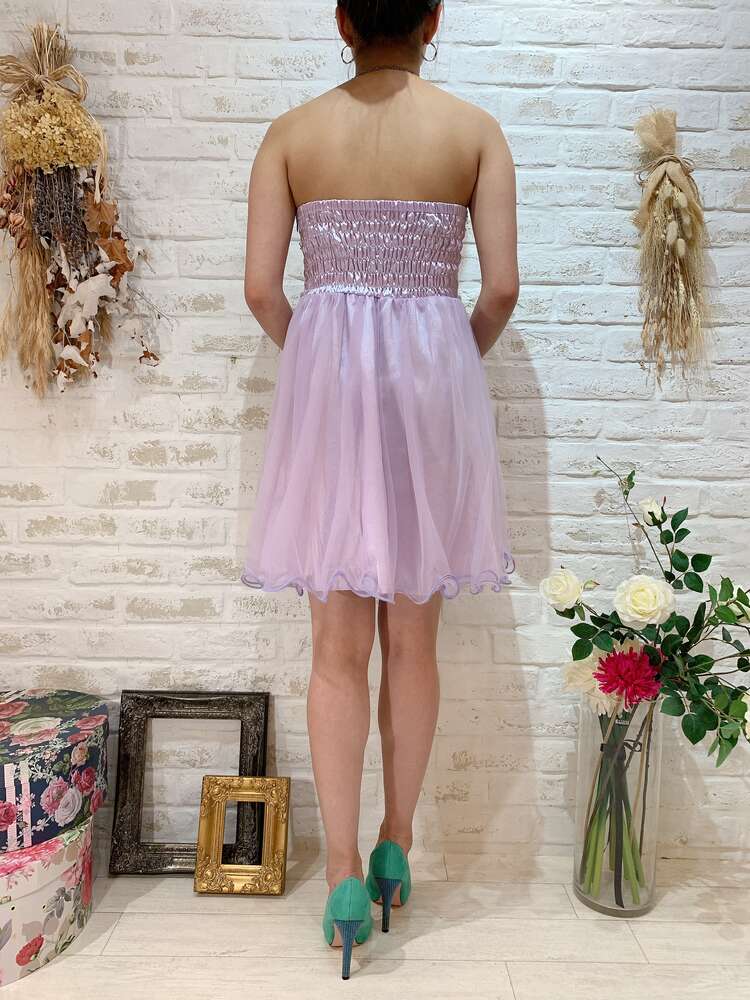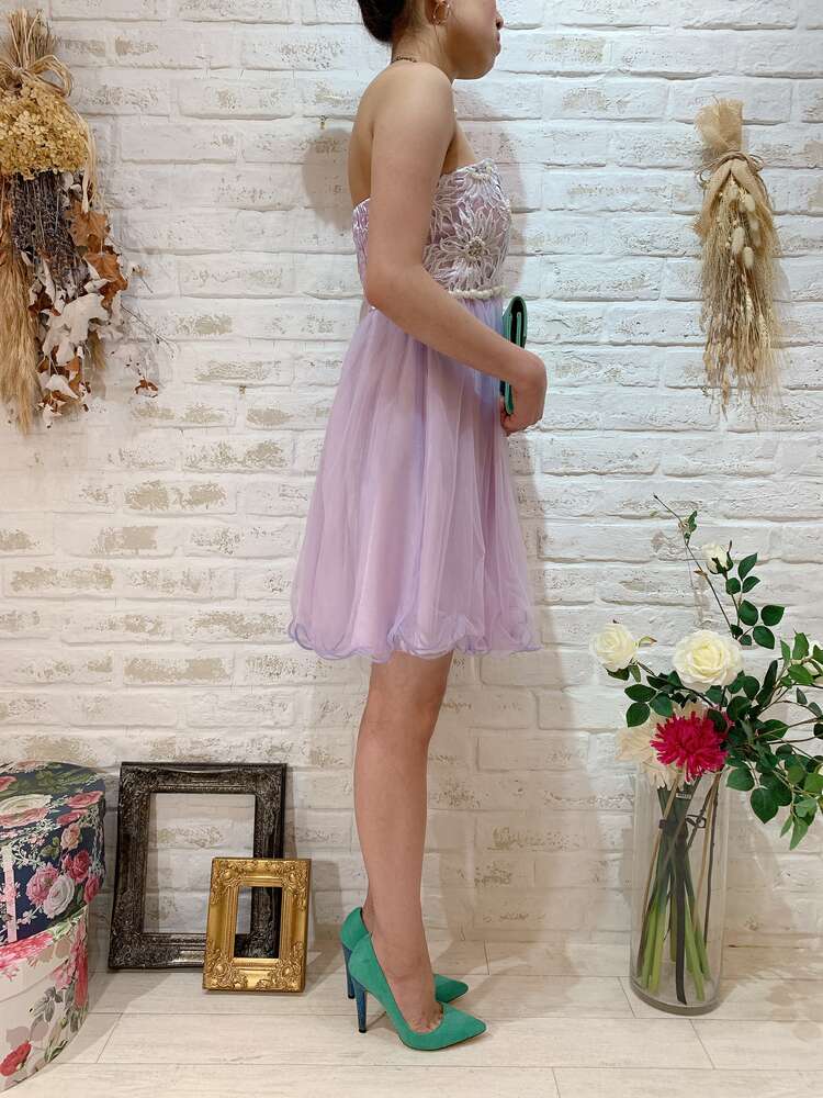 きれいなラベンダーカラーが魅力的なミニベアドレスです。花柄のレース使いとパールがキュートな1着。スカートはチュール素材でふんわりとしたシルエットです。着丈は短めなので身長が低い方もバランス良く着用して頂けます。背中部分はシャーリングゴムで伸縮性有り。結婚式参列、女子会、謝恩会などにもおすすめ。結婚式参列などお呼ばれシーンにはボレロやストールなど羽織り物を羽織って頂くと露出感も安心です。4着ございますのでブライズメイドにもおすすめの商品です。
