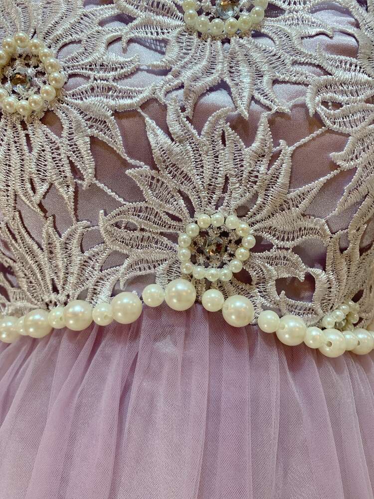 きれいなラベンダーカラーが魅力的なミニベアドレスです。花柄のレース使いとパールがキュートな1着。スカートはチュール素材でふんわりとしたシルエットです。着丈は短めなので身長が低い方もバランス良く着用して頂けます。背中部分はシャーリングゴムで伸縮性有り。結婚式参列、女子会、謝恩会などにもおすすめ。結婚式参列などお呼ばれシーンにはボレロやストールなど羽織り物を羽織って頂くと露出感も安心です。4着ございますのでブライズメイドにもおすすめの商品です。