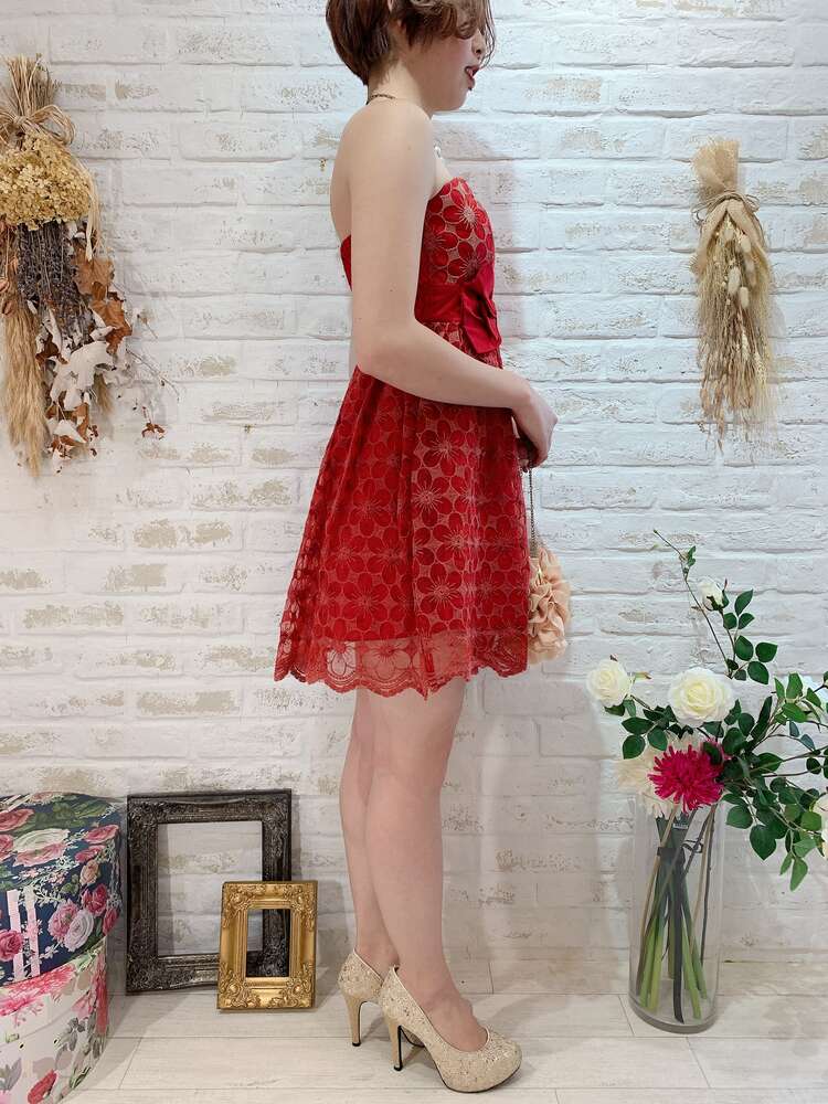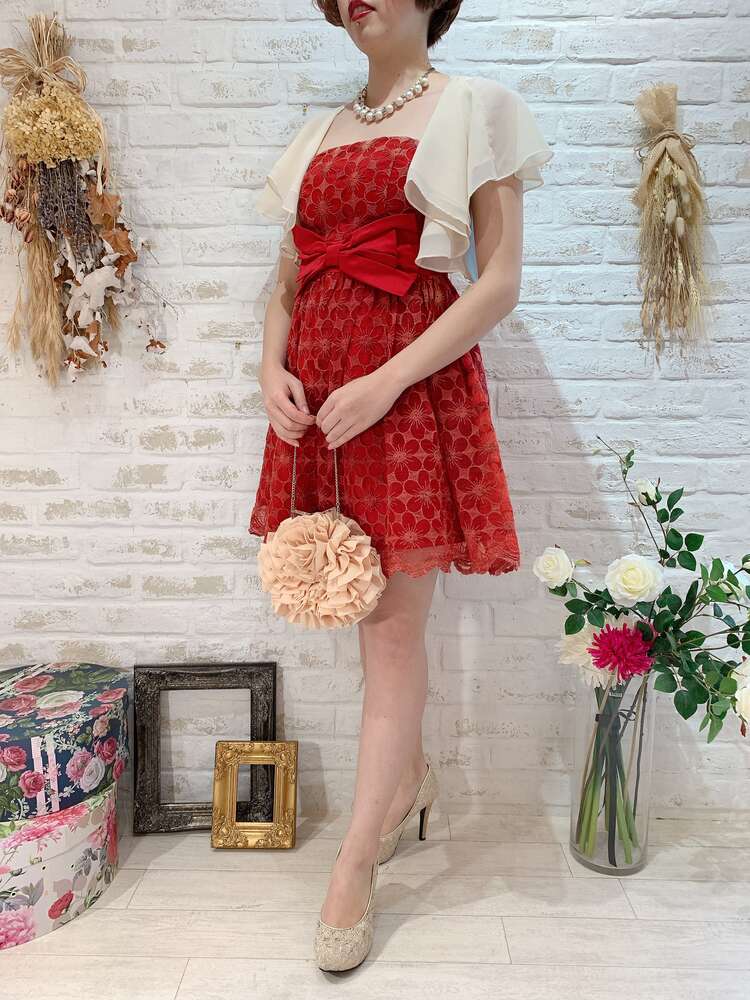 キュートなウエストリボンがポイントのレッドカラーミニベアドレスです。フロントについた大きめのリボンが可愛らしさを与えつつウエストをマークしてスタイルアップ効果も期待できそうです。透け感のあるハリのある花柄素材をかぶせたデザイン。裾がレースのようにカットされており魅力的です。数着ございますのでブライズメイドにも◎ 1年中着用できる生地感ですが落ち着いたレッドカラーはクリスマスにも活躍するカラーです。結婚式参列、女子会、謝恩会などにもおすすめ。結婚式参列などお呼ばれシーンにはボレロやストールなど羽織り物を羽織って頂くと露出感も安心です。