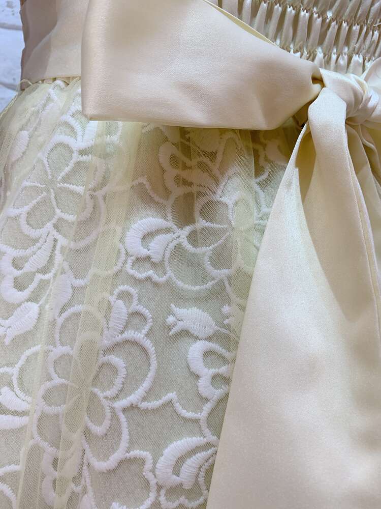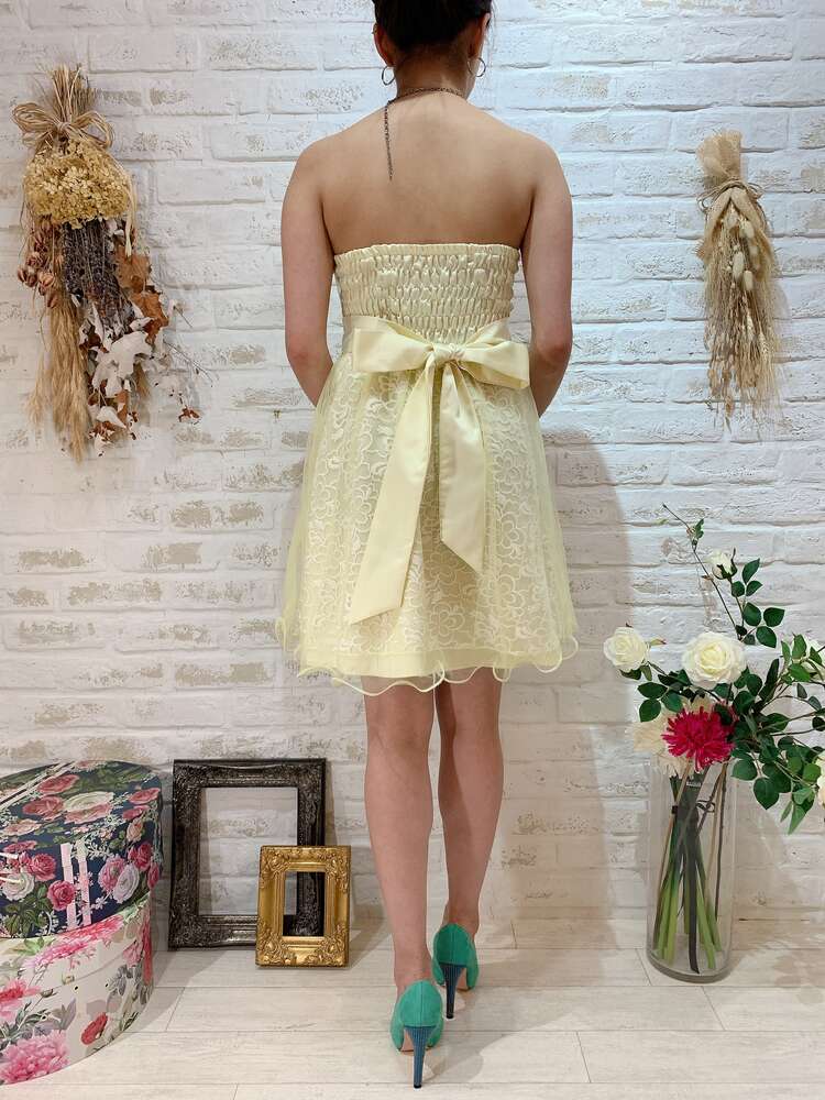 パステルイエローがキュートでさわやかなミニベアドレスです。花柄刺繍の上にチュール生地が重なったデザインです。ウエストのリボンはバックで結んでもフロントで結んでも可愛いです。着丈は短めなので身長が低い方もバランス良く着用して頂けます。背中部分はシャーリングゴムで伸縮性有り。結婚式参列、女子会、謝恩会などにもおすすめ。結婚式参列などお呼ばれシーンにはボレロやストールなど羽織り物を羽織って頂くと露出感も安心です。数着ございますのでブライズメイドにもおすすめの商品です。