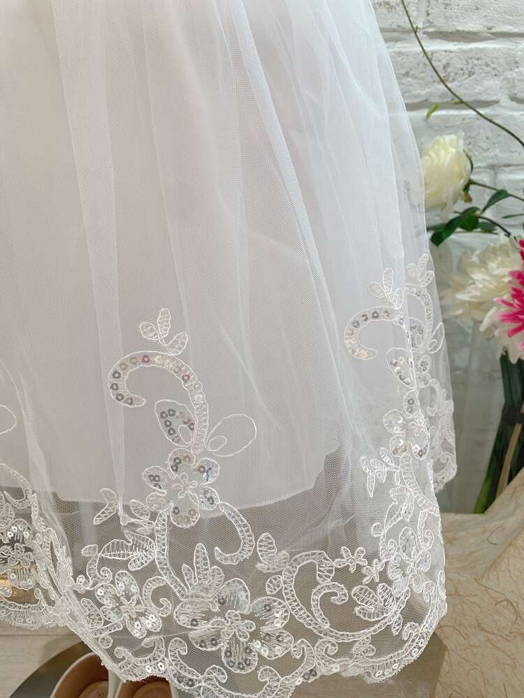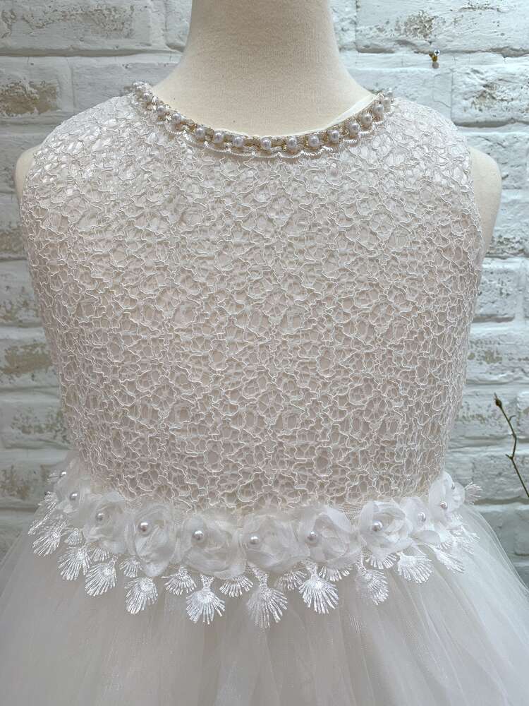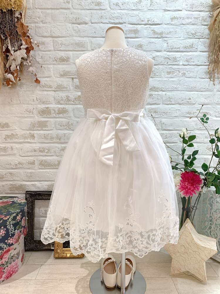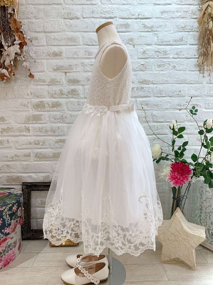 <商品詳細>フラワーガール、リングガール、発表会やオーディションに活躍すること間違いなしのホワイトカラーのキッズドレスです。ネックラインにはお顔を華やかに見せてくれるパールがついています。ウエストのお花も可愛らしいポイント。チュールスカートの裾には繊細なレースがほどこされておりスパンコールがきらきらと輝きます。やや光沢感のあるサテン地のウエストリボンは後ろで蝶々結びにしてロマンティックな雰囲気に♪ ※画像は別商品のキッズ用パニエを着用して撮影しております。