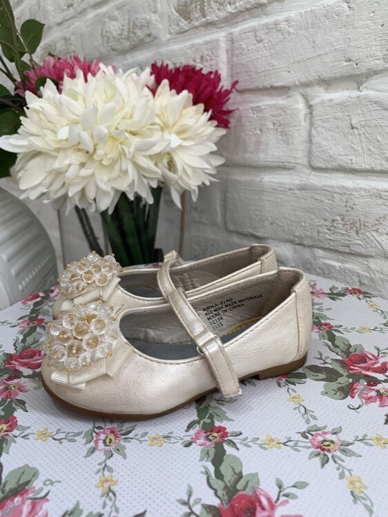 コサージュ付ストラップホワイトキッズシューズUS4