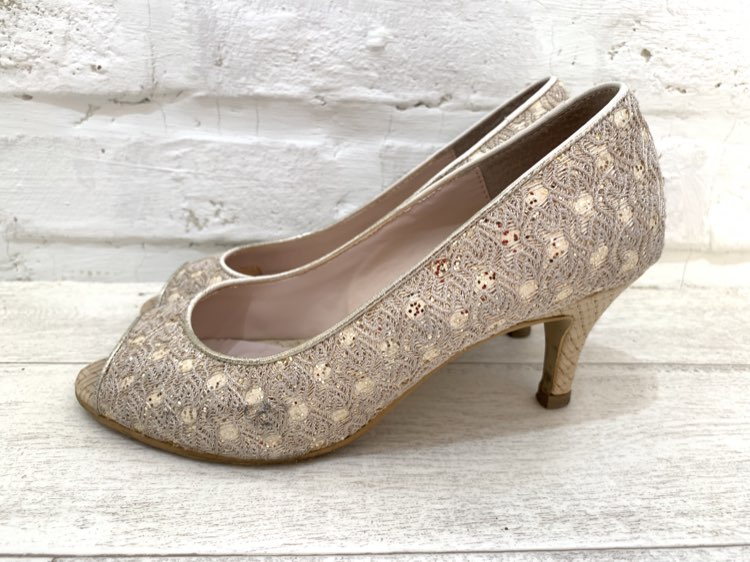 ゴールドラメレース低めオープントゥパンプス23.5