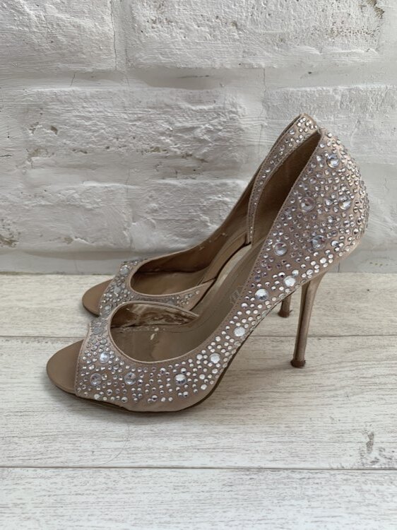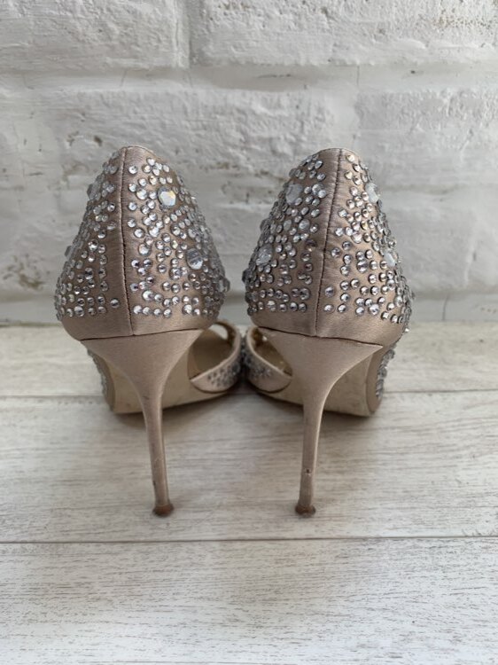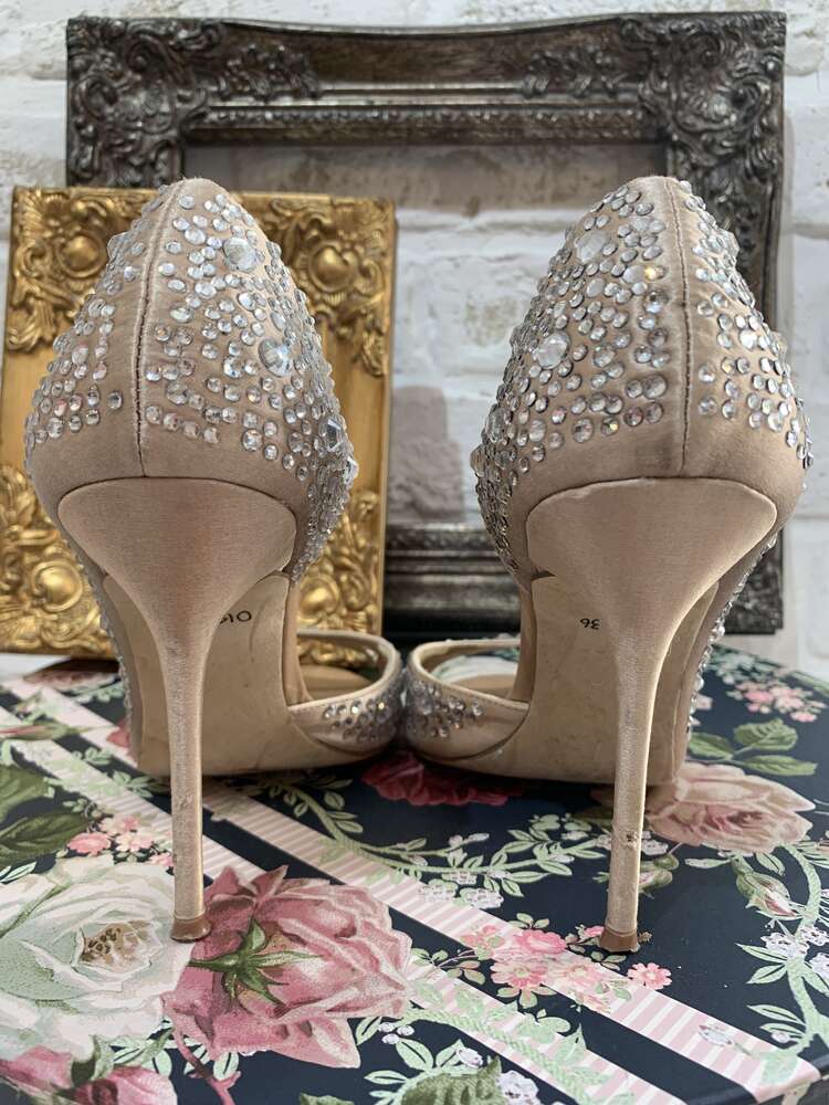 ストーン付ピンクベージュオープントゥパンプス