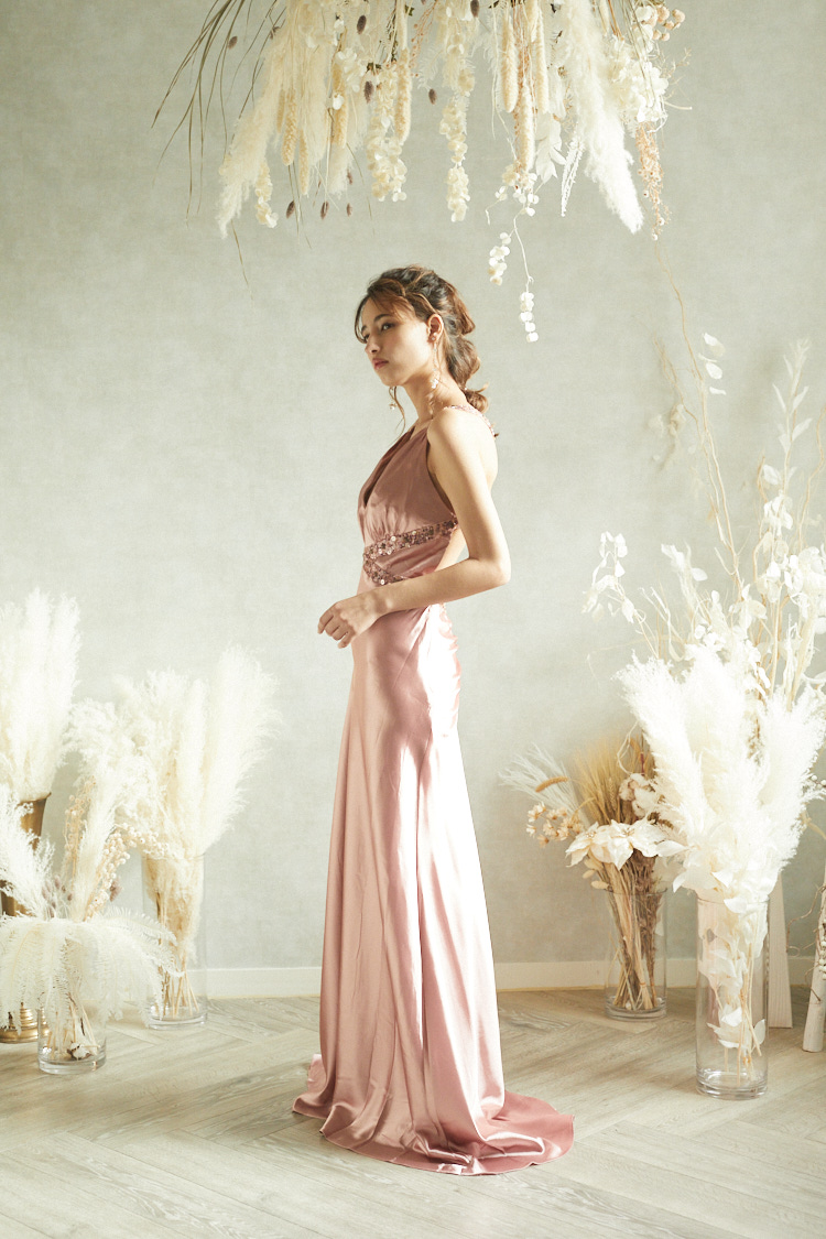 ウエスト肩ビジュースモーキーピンクサテンロングドレス
