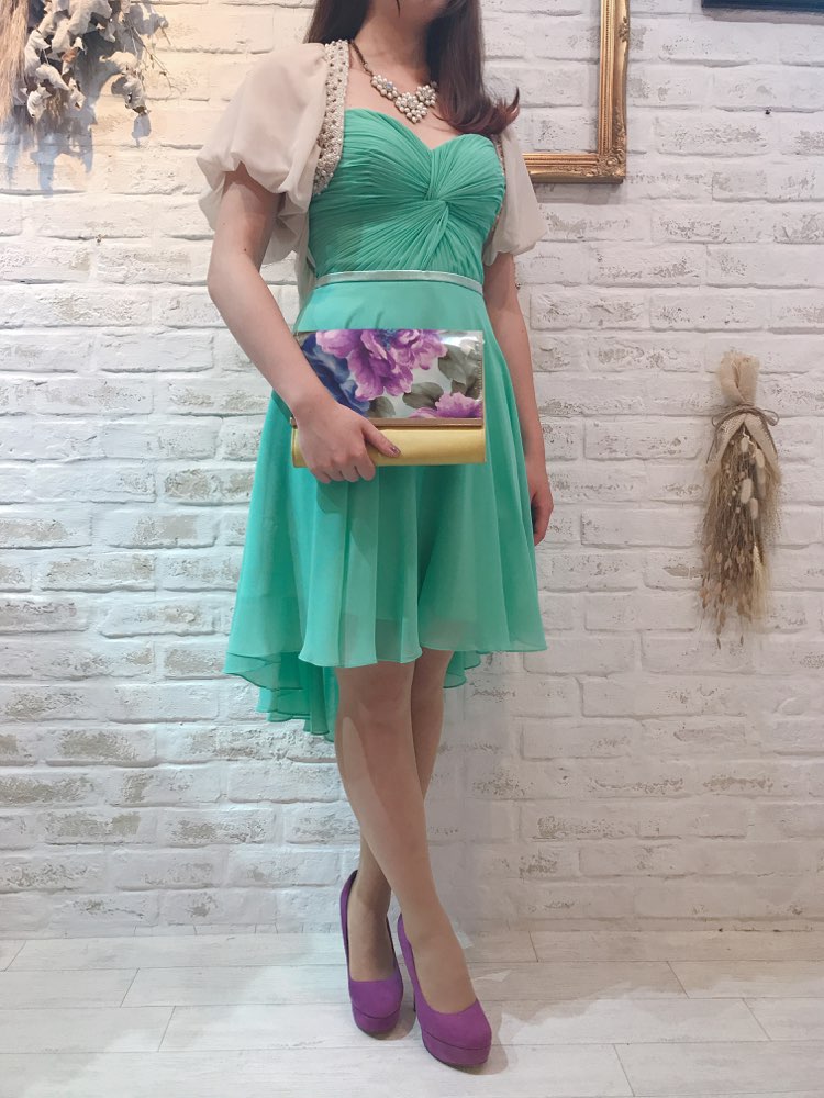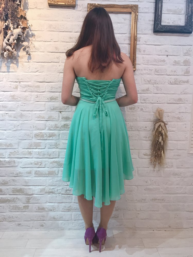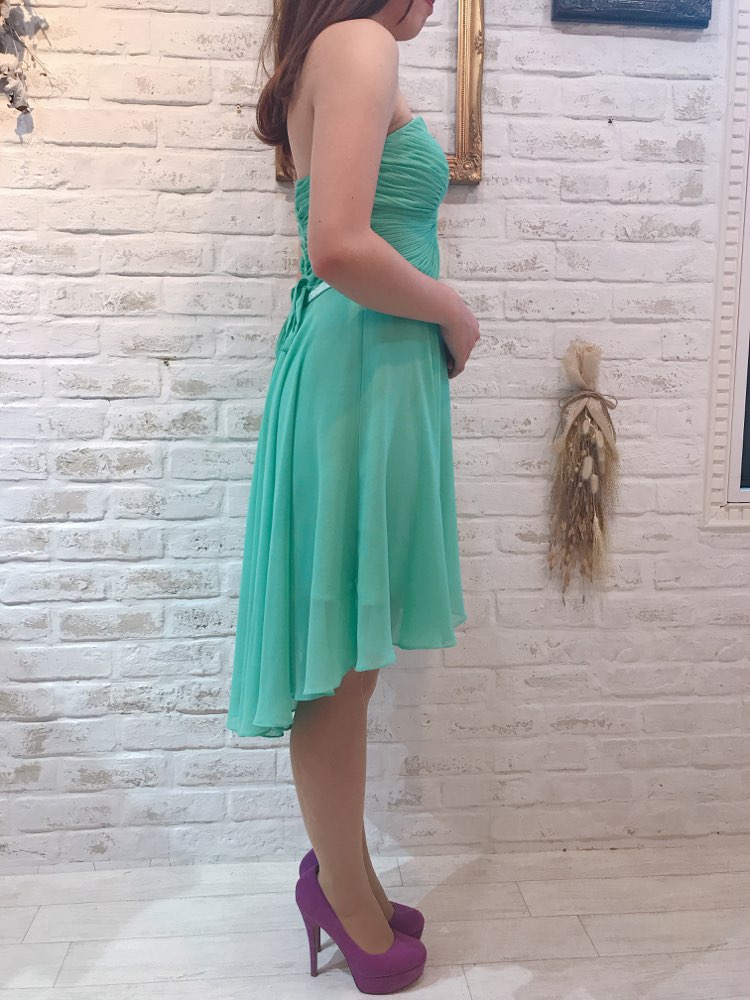 マーメイドを思わせる人気のフィッシュテールスカートベアドレスです。フロントが短くバックが長いフィッシュテールスカートは脚を美しく見せてくれる効果有り。歩くとひらっとする後ろの裾が魅力的なドレスです。背中部分はあみあげ式でサイズを調整するタイプ。やわらかい爽やかなミントグリーンです。お食事会や各種パーティー、謝恩会などにおすすめの1着です。結婚式参列などお呼ばれシーンにはボレロやストールなどを羽織ると露出もおさえられて◎です!