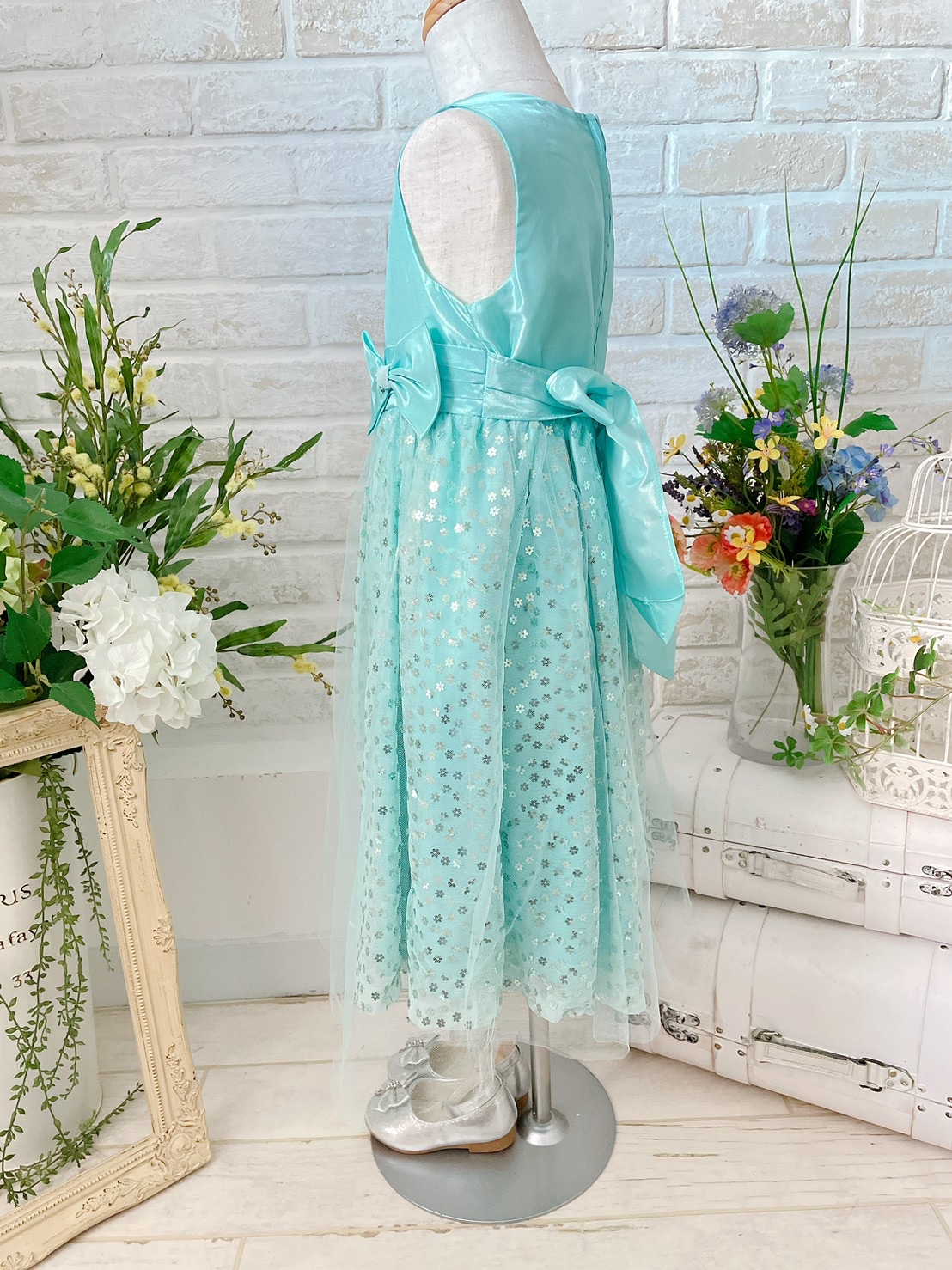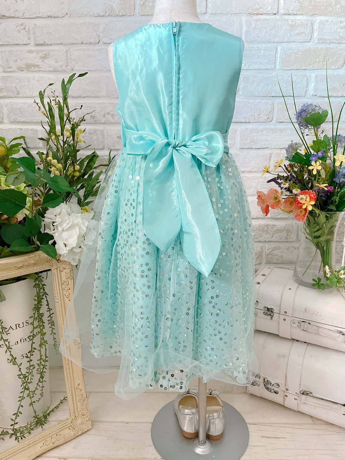 お花型スパンコールがポイントの1着です。ウエストにはかわいらしいリボン付き。お花型スパンコールが施されたキラキラとした生地の上に1枚チュールが重なっている作りになっています。(チュールに数か所穴があいております。状態欄をご確認ください。)結婚式のおよばれ、フラワーガール、リングガール、発表会、演奏会、七五三にもおすすめです。※画像は別商品のキッズ用パニエを着用して撮影しております。