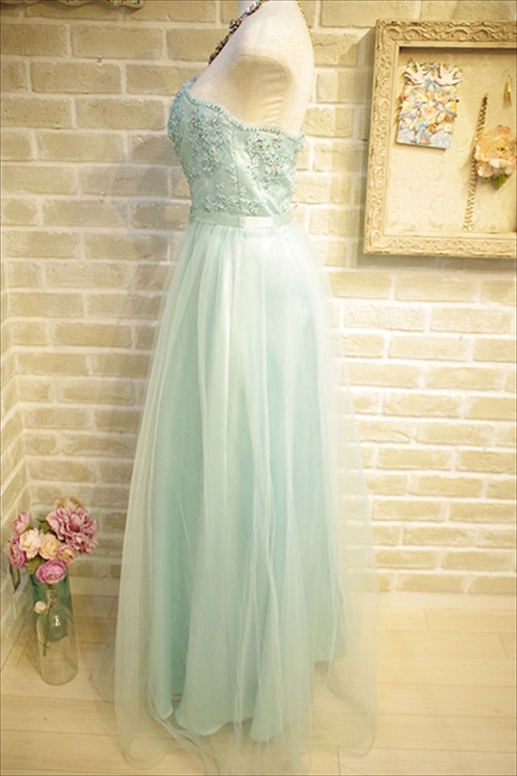 さわやかで綺麗なミントグリーンカラーが印象的なボリュームベアドレスです。華やかで主役級な着こなしへと導いてくれる、Aラインのロングドレス。ウェストのビジューがとても華やかで大人かわいい女性にぴったりです。パーティーや花嫁さんの二次会パーティー、演奏会にもオススメです。