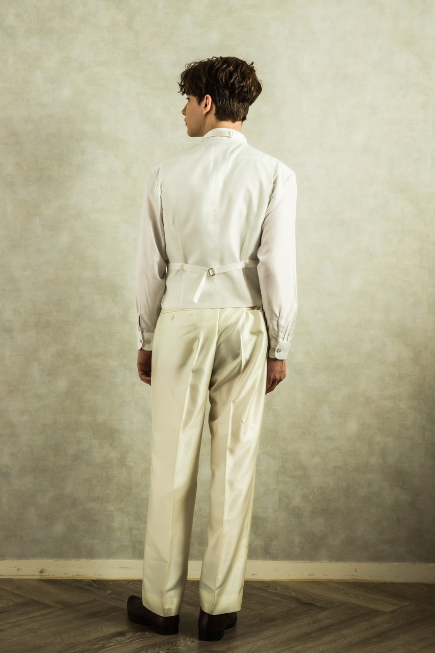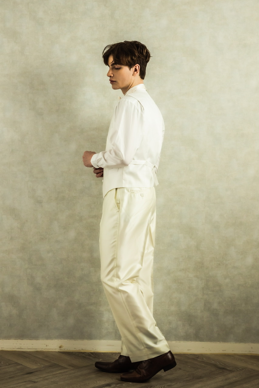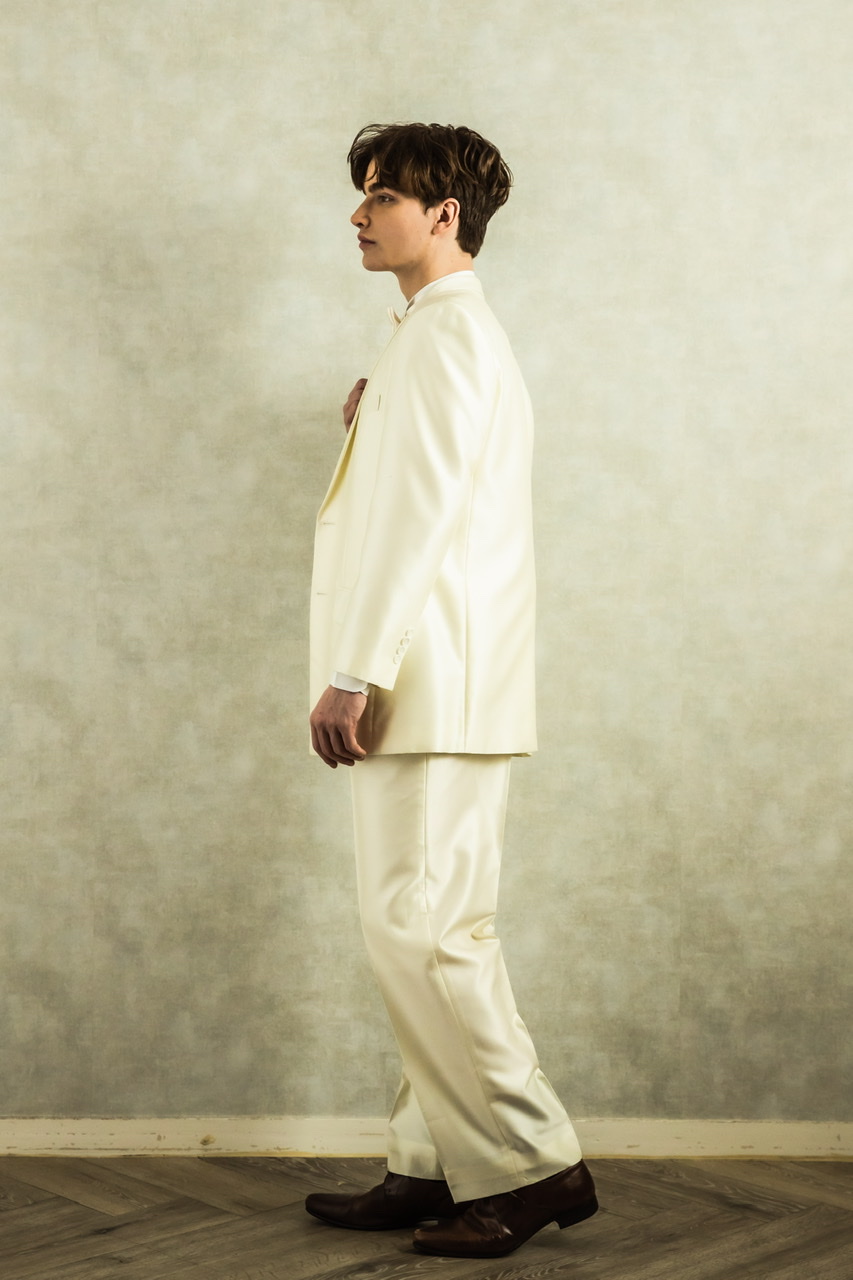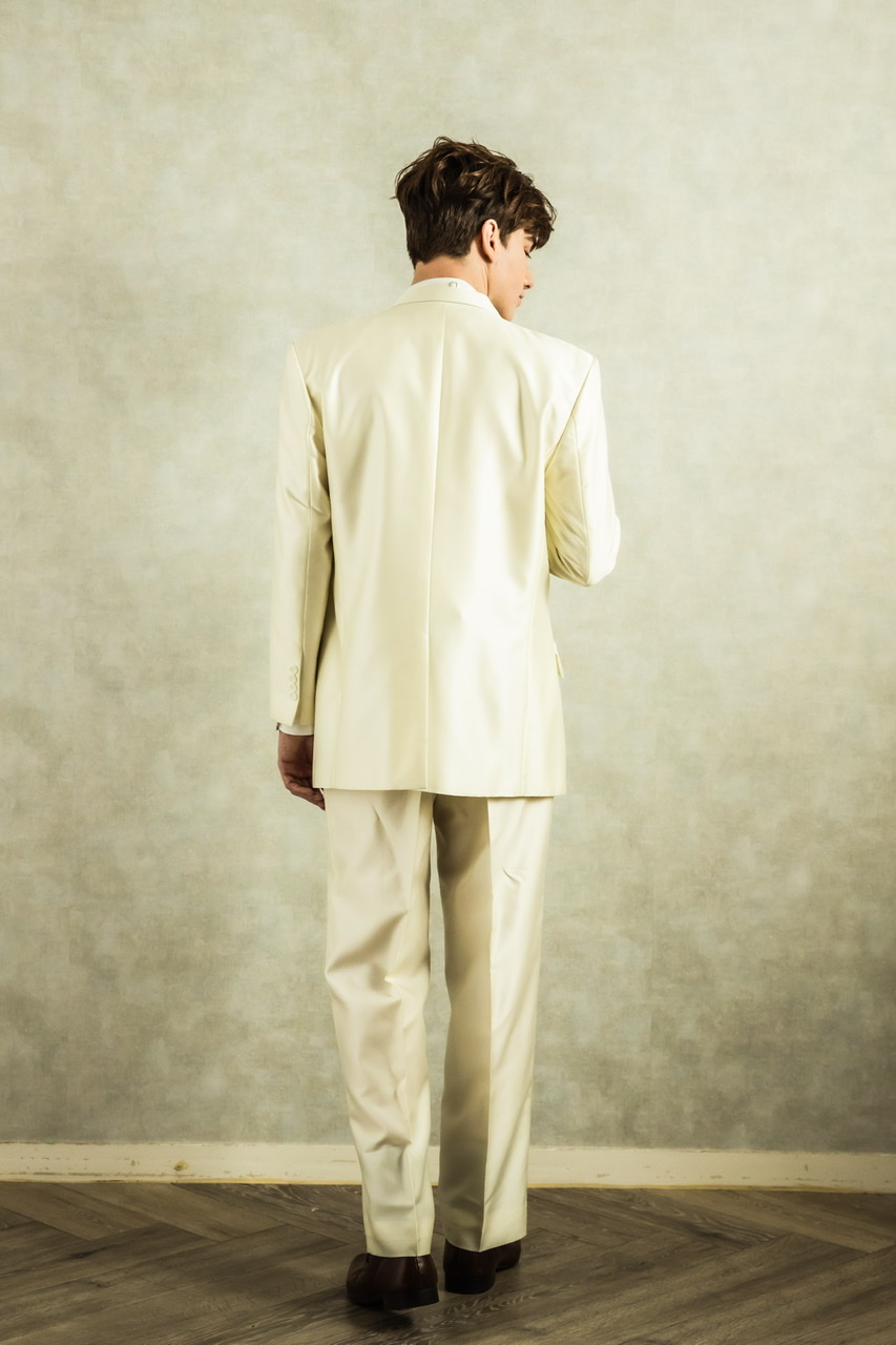 ホワイト。アイボリー(白)の光沢のあるタキシード。下襟の先がとがったピークドラぺルタイプ。ジャケット、パンツの2ピースタイプ。ベストはチェックやストライプ柄や、スモーキーピンク、ブラック、ブルーなどのベストを差し色として合わせるのもオススメです。合わせるシャツをチェック、ドット、ストライプ、花柄、ネイビー、ブラック、グレーシャツで合わせてカジュアルな二次会タキシードとしても素敵。また白のウィングカラーシャツを合わせればきちんとした結婚式や披露宴向けのフォーマルなコーディネートになります。披露宴・結婚式・パーティースーツ・二次会・海外ウェディング・フォトウェディング、前撮りにまで幅広いシーンでご使用いただけます。オールシーズンに適してます。