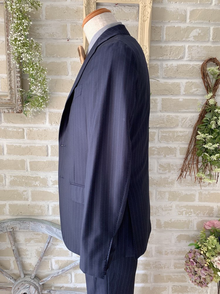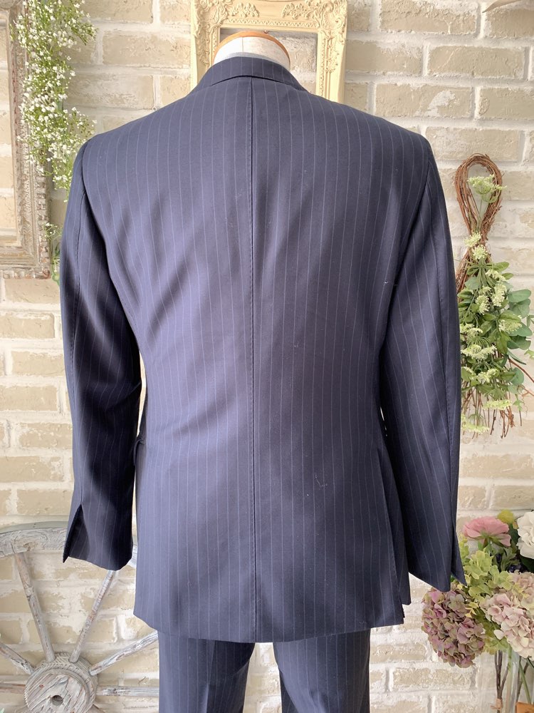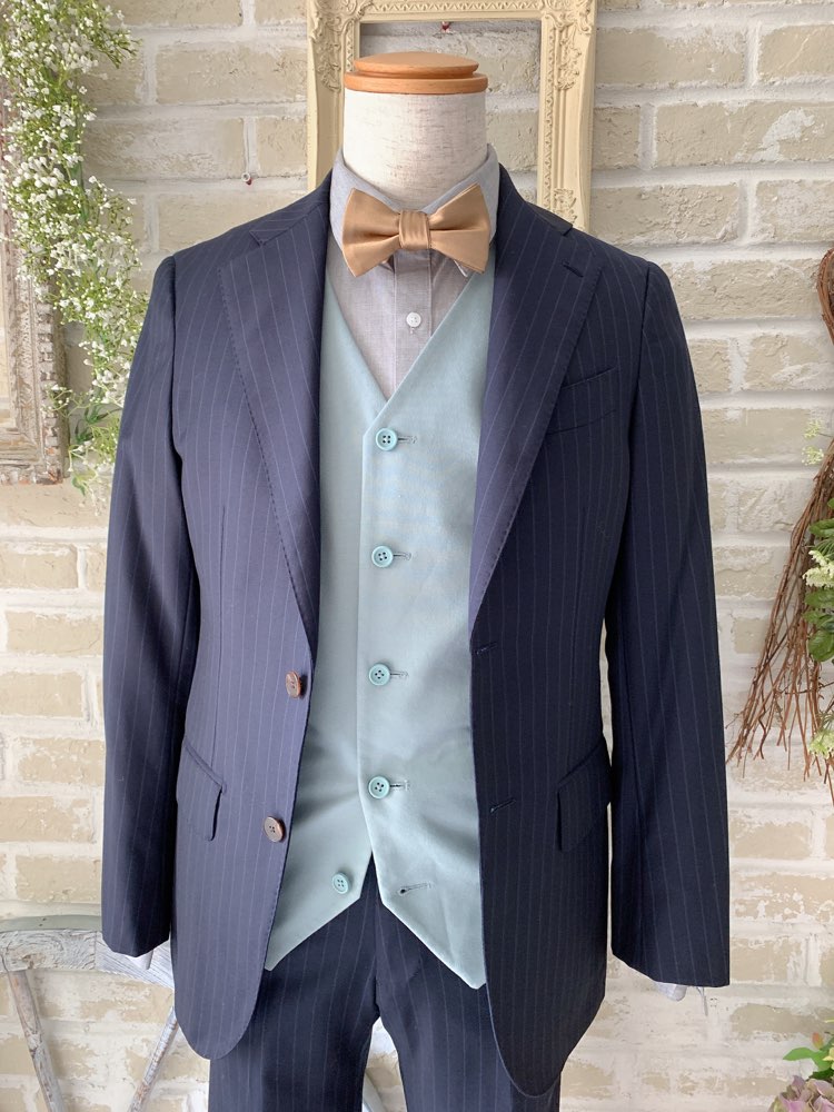 ネイビー地にストライプ柄の光沢のないスーツ。下襟の先がとがったピークドラぺルタイプ。ジャケット、パンツの2ピースタイプ。ベストは、ネイビー、スモーキーピンク、グレー、ライトブルーなどの無地ベストを差し色として合わせるのもオススメです。合わせるシャツをチェック、ドット柄や、ネイビー、ブラック、グレーシャツで合わせてカジュアルな二次会タキシードとしても素敵。また白のウィングカラーシャツを合わせればきちんとした結婚式や披露宴向けのフォーマルなコーディネートになります。披露宴・結婚式・ゲスト結婚式の参列向け。パーティースーツ・二次会・海外ウェディング・フォトウェディング、前撮りにまで幅広いシーンでご使用いただけます。秋冬に適してます。