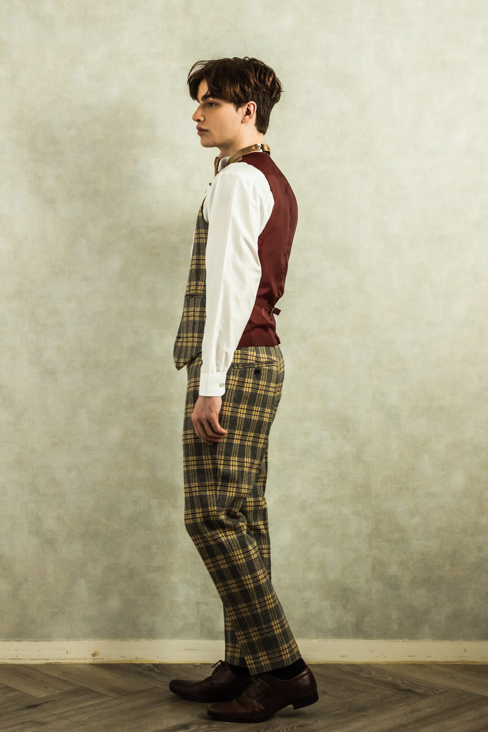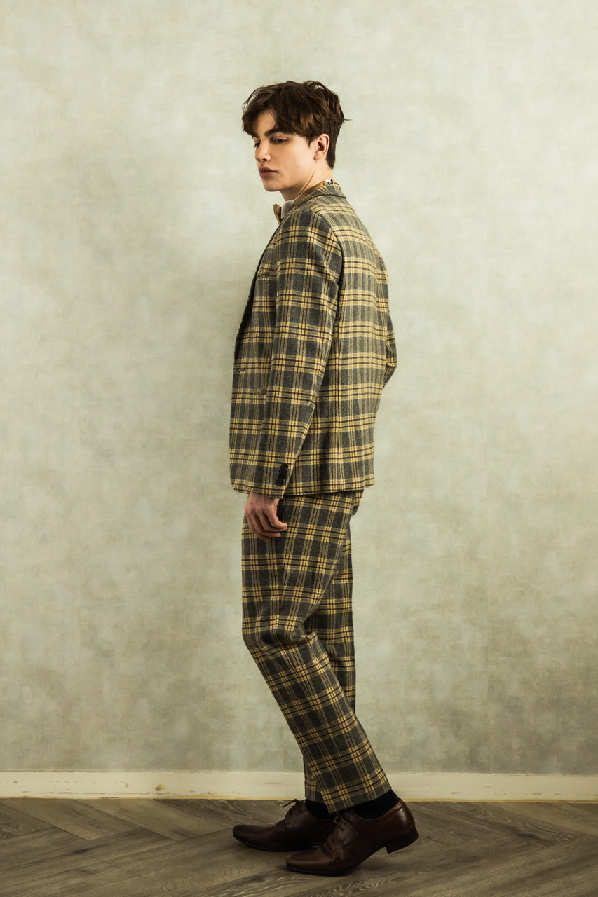 グレー地にイエローのチェック柄のウール素材の秋冬向けのタキシード。下襟の先がとがったピークドラぺルタイプ。。ジャケット、パンツ、ベストの3ピースタイプ。ベストは、セットで合わせても素敵ですが、ライトグレー、ホワイト、ベージュ、ネイビーなどのベストを差し色として合わせるのもオススメです。合わせるシャツをデニム素材、細かなドット柄、ネイビー、ライトブルー、ライトグレーシャツで合わせてカジュアルな二次会タキシードとしても素敵。また白のウィングカラーシャツを合わせればきちんとした結婚式や披露宴向けのフォーマルなコーディネートになります。披露宴・結婚式・ゲスト結婚式の参列向け。パーティースーツ・二次会・海外ウェディング・フォトウェディング、前撮りにまで幅広いシーンでご使用いただけます。秋冬シーズンに適してます。