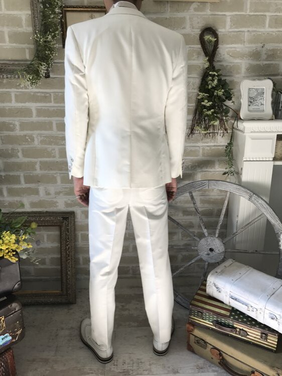 ホワイト。アイボリー(白)の光沢のあるタキシード。下襟の先がとがったピークドラぺルタイプ。ジャケット、パンツの2ピースタイプ。ベストはチェックやストライプ柄や、スモーキーピンク、ブラック、ブルーなどのベストを差し色として合わせるのもオススメです。合わせるシャツをチェック、ドット、ストライプ、花柄、ネイビー、ブラック、グレーシャツで合わせてカジュアルな二次会タキシードとしても素敵。また白のウィングカラーシャツを合わせればきちんとした結婚式や披露宴向けのフォーマルなコーディネートになります。披露宴・結婚式・パーティースーツ・二次会・海外ウェディング・フォトウェディング、前撮りにまで幅広いシーンでご使用いただけます。オールシーズンに適してます。