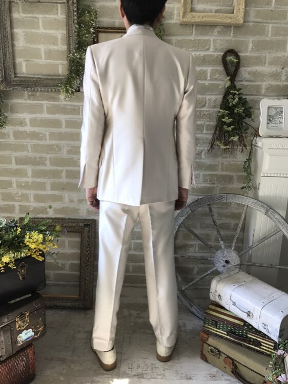身ごろの左下にうっすらとしたシミあり。ピンクベージュ・シャンパン・ベージュ・グレージュの光沢のあるモーニングコート。下襟の先がとがったピークドラぺルタイプです。モーニングコートは昼間の時間帯で最も格式の高い正礼装です。シングルブレストという生地を重ねないい形でボタンは一つ。きちんと感を大切にされたい新郎様や非日常を味わいたい方にオススメのスタイルです。ジャケット、ベスト、パンツの3ピースタイプ。少しおしゃれなカジュアルに着崩すならベストはチェックやストライプ柄や、ワインレッド、ゴールド、シルバー、グレー、スモーキーピンク、ブラック、ブルーなどのベストを差し色として合わせるのもオススメです。合わせるシャツをチェック、ドット、ストライプ、花柄、ネイビー、ブラック、グレーシャツで合わせてカジュアルな二次会タキシードとしても素敵。また白のウィングカラーシャツを合わせればきちんとした結婚式や披露宴向けのフォーマルなコーディネートになります。披露宴・結婚式・パーティースーツ・二次会・海外ウェディング・フォトウェディング、前撮りにまで幅広いシーンでご使用いただけます。オールシーズンに適してます。