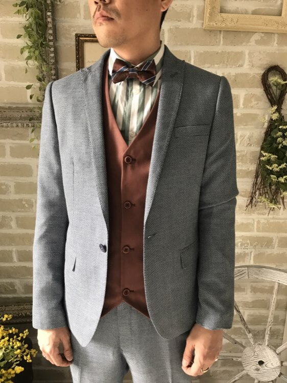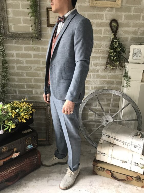 ライトブルーの光沢のないカジュアルなウールミックス素材のスーツ・タキシード。下襟の先がとがったピークドラぺルタイプ。ジャケット、パンツの2ピースタイプ。ベストはチェックやストライプ柄や、スモーキーピンク、ブラック、ブルーなどのベストを差し色として合わせるのもオススメです。合わせるシャツをチェック、ドット、ストライプ、花柄、ネイビー、ブラック、グレーシャツで合わせてカジュアルな二次会タキシードとしても素敵。また白のウィングカラーシャツを合わせればきちんとした結婚式や披露宴向けのフォーマルなコーディネートになります。披露宴・結婚式・ゲスト結婚式の参列向け。パーティースーツ・二次会・海外ウェディング・フォトウェディング、前撮りにまで幅広いシーンでご使用いただけます。春・秋・冬のシーズンに適してます。