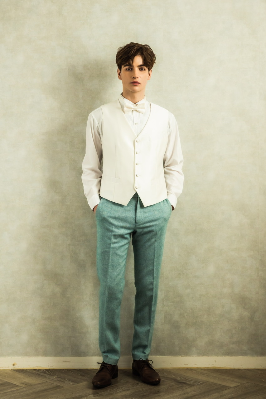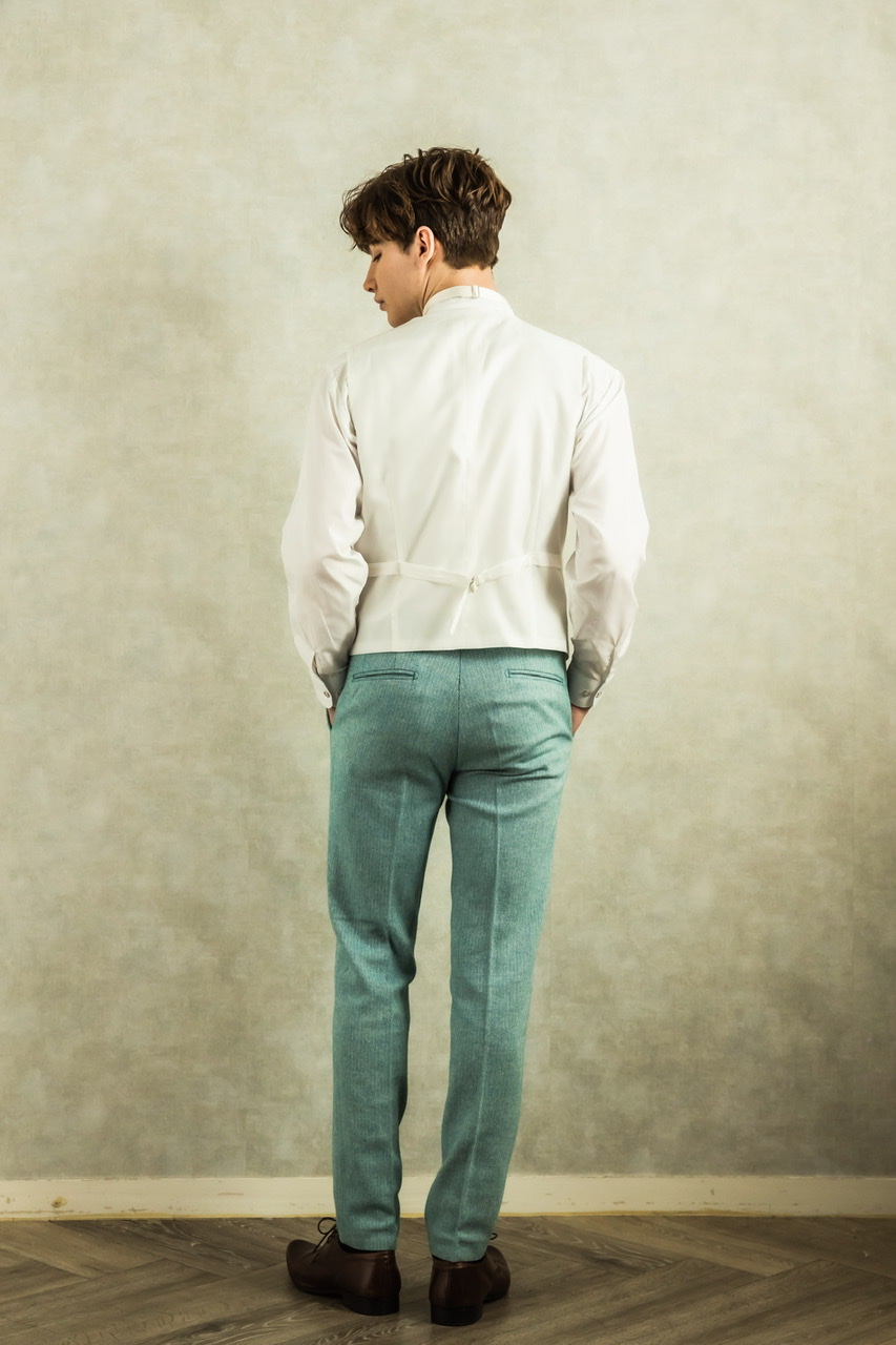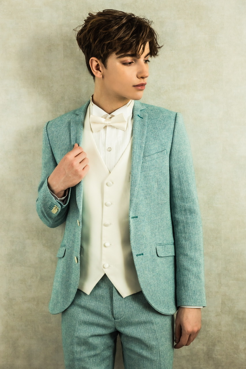 綺麗なスカイブルーの光沢のないカジュアルなウールミックス素材のスーツ・タキシード。下襟の先がとがったピークドラぺルタイプ。ジャケット、パンツの2ピースタイプ。ベストはチェックやストライプ柄や、スモーキーピンク、ブラック、ブルーなどのベストを差し色として合わせるのもオススメです。合わせるシャツをチェック、ドット、ストライプ、花柄、ネイビー、ブラック、グレーシャツで合わせてカジュアルな二次会タキシードとしても素敵。また白のウィングカラーシャツを合わせればきちんとした結婚式や披露宴向けのフォーマルなコーディネートになります。披露宴・結婚式・ゲスト結婚式の参列向け。パーティースーツ・二次会・海外ウェディング・フォトウェディング、前撮りにまで幅広いシーンでご使用いただけます。春・秋・冬に適してます。