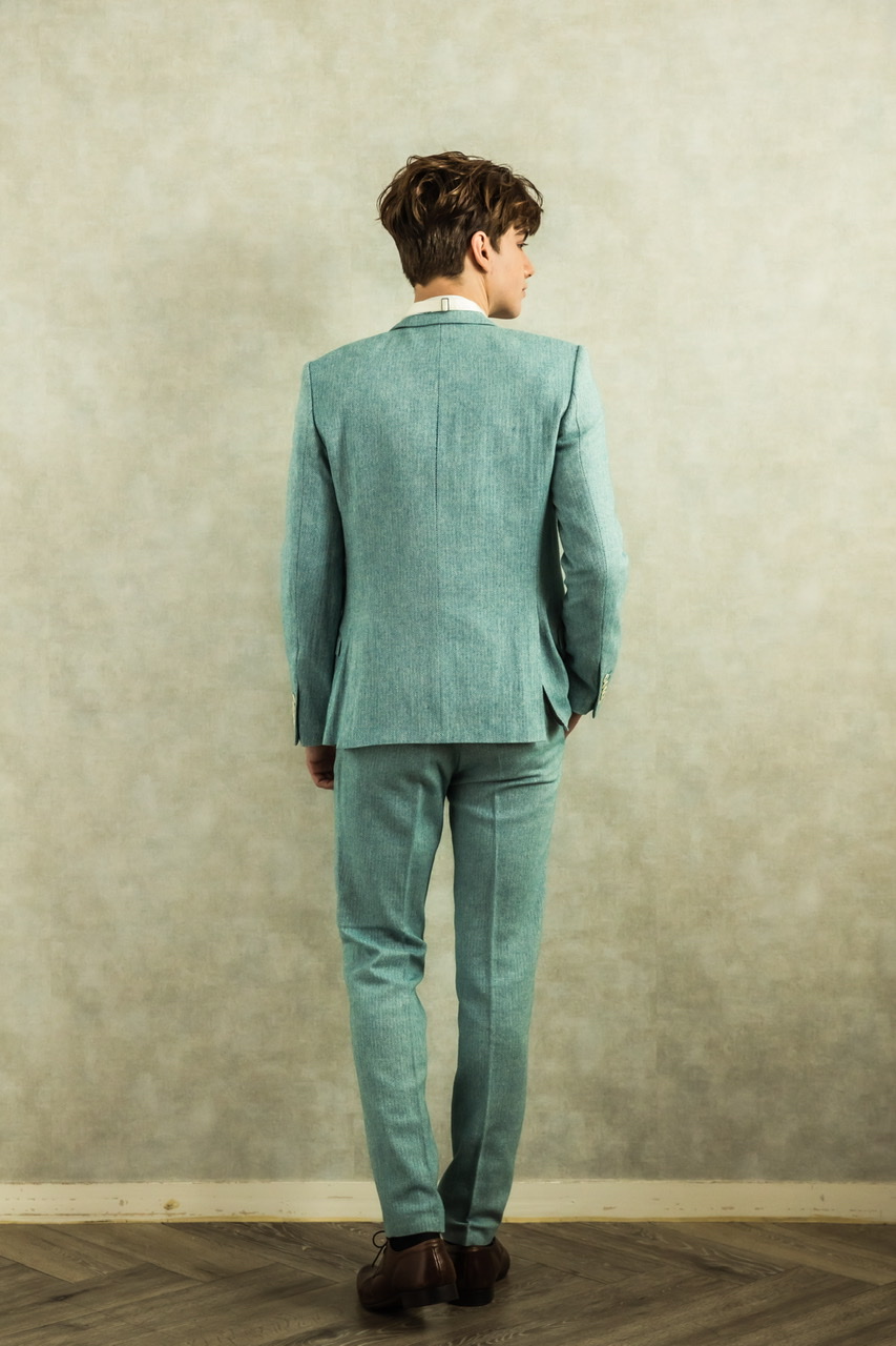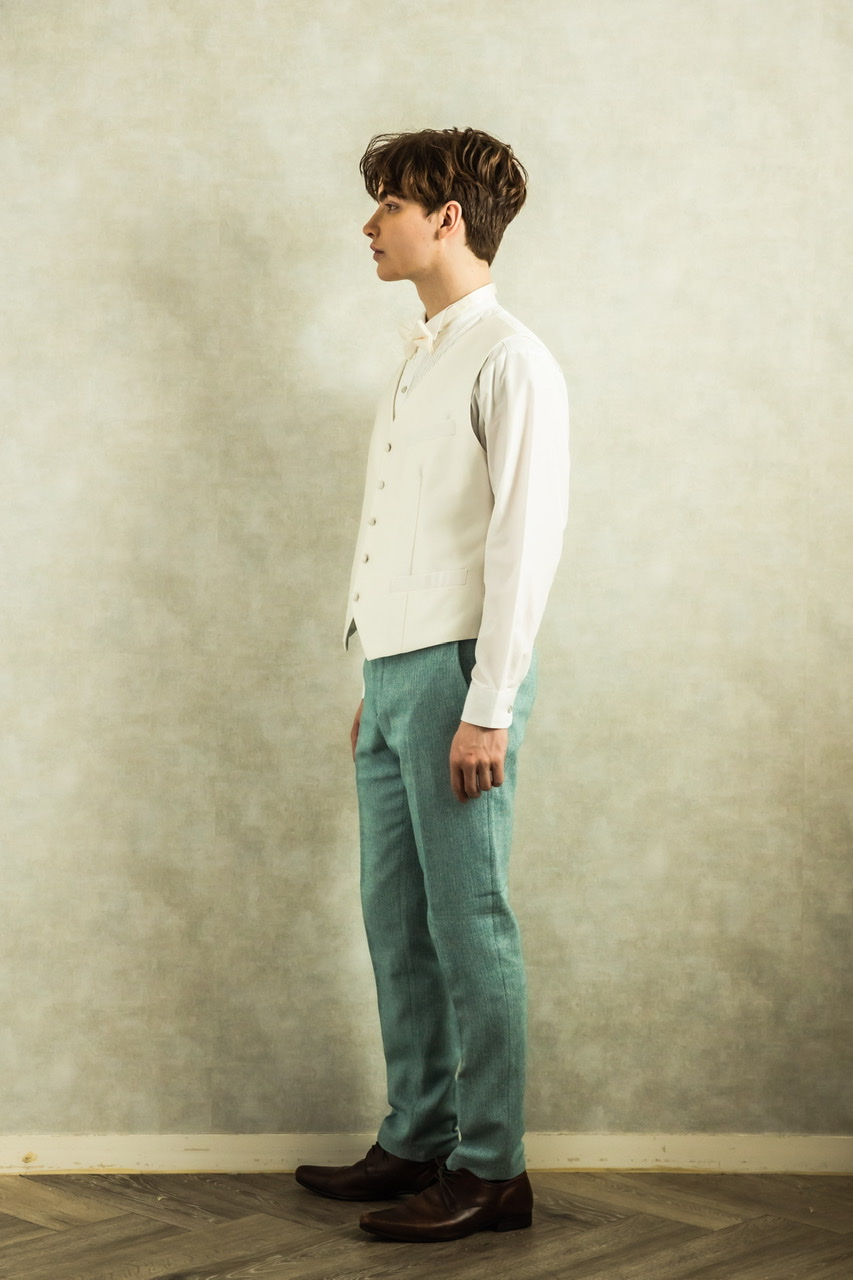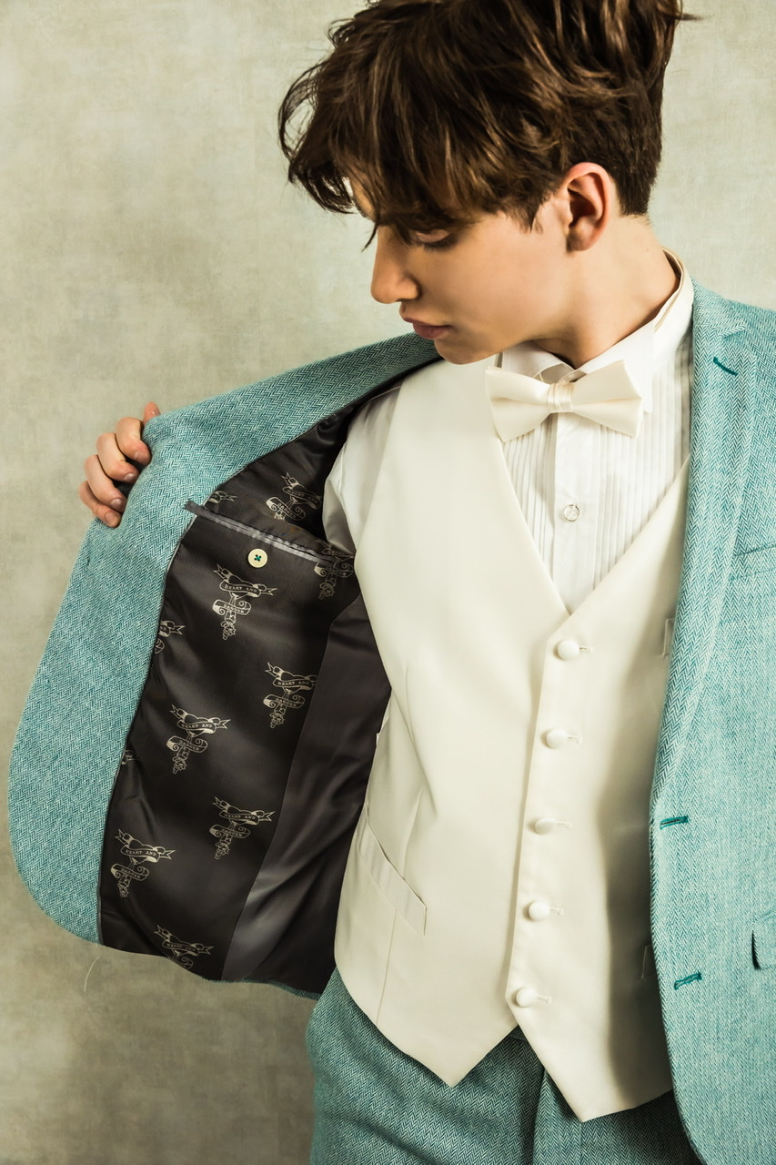 綺麗なスカイブルーの光沢のないカジュアルなウールミックス素材のスーツ・タキシード。下襟の先がとがったピークドラぺルタイプ。ジャケット、パンツの2ピースタイプ。ベストはチェックやストライプ柄や、スモーキーピンク、ブラック、ブルーなどのベストを差し色として合わせるのもオススメです。合わせるシャツをチェック、ドット、ストライプ、花柄、ネイビー、ブラック、グレーシャツで合わせてカジュアルな二次会タキシードとしても素敵。また白のウィングカラーシャツを合わせればきちんとした結婚式や披露宴向けのフォーマルなコーディネートになります。披露宴・結婚式・ゲスト結婚式の参列向け。パーティースーツ・二次会・海外ウェディング・フォトウェディング、前撮りにまで幅広いシーンでご使用いただけます。春・秋・冬に適してます。