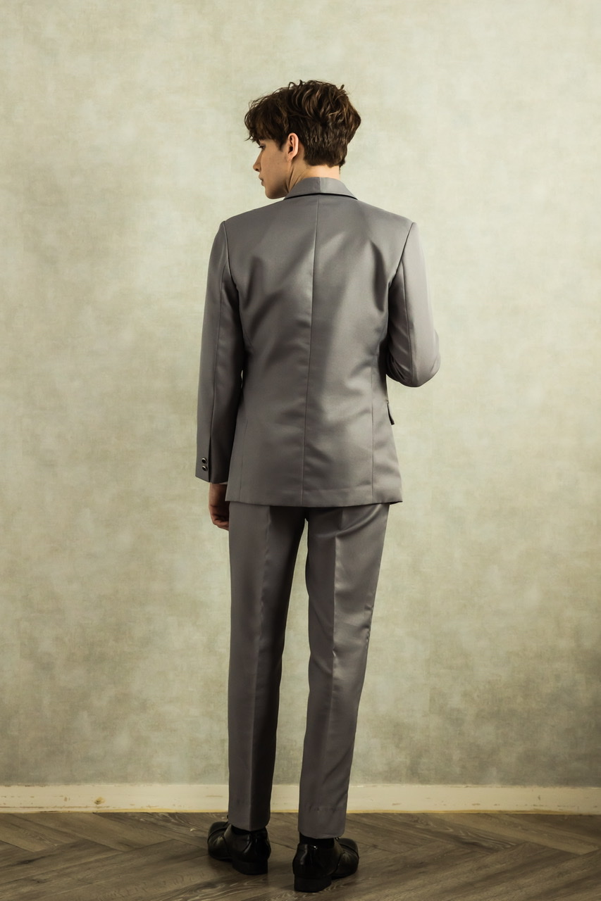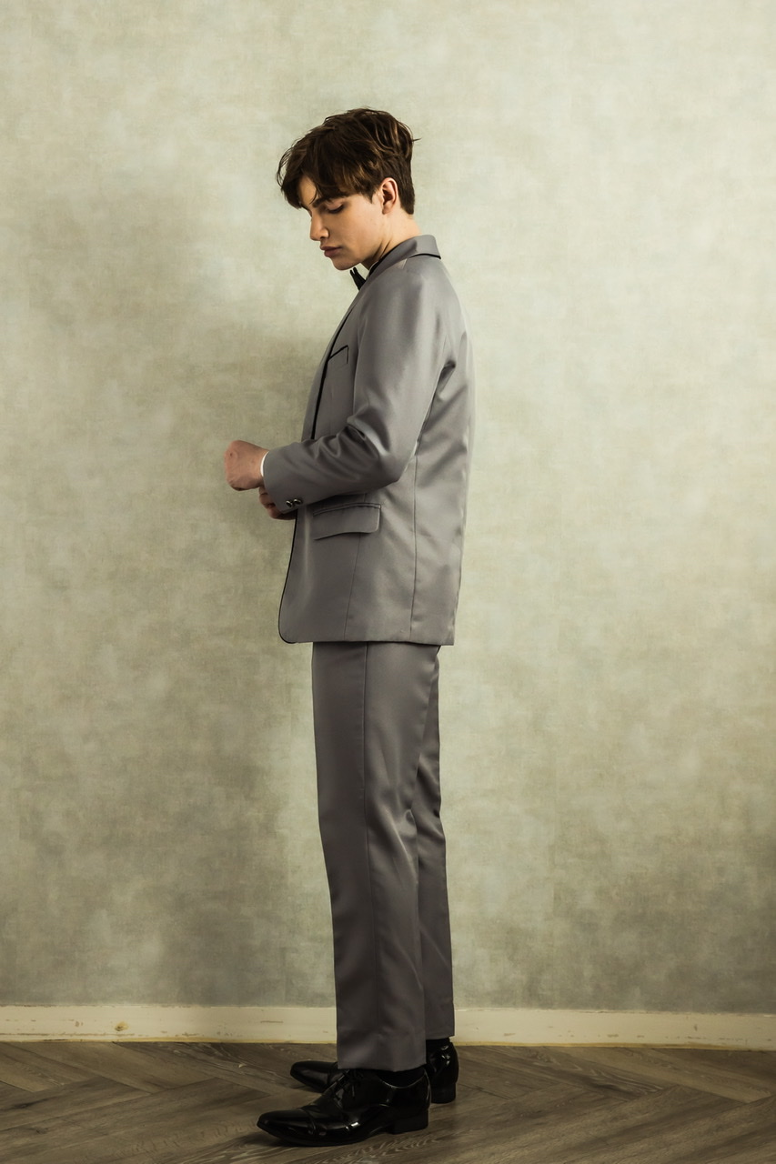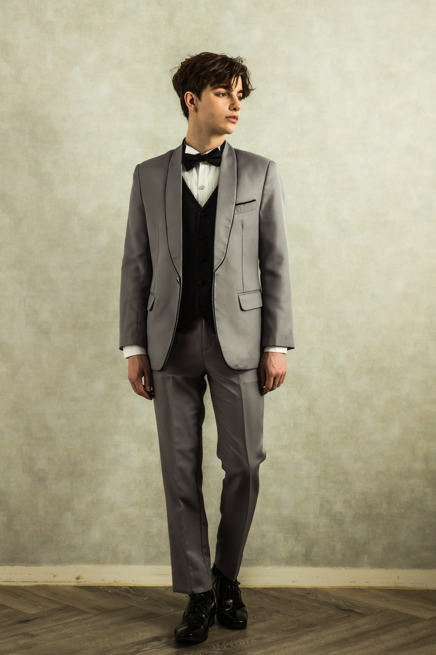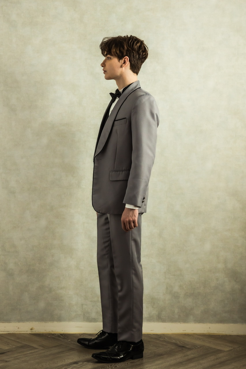 ライトグレーのブラックの細めの黒いパイピングの入ったタキシード。ショール・カラータイプ。。ジャケット、パンツの2ピースタイプ。ベストはシェックやストライプ柄や、スモーキーピンク、ブラック、ブルーなどのベストを差し色として合わせるのもオススメです。合わせるシャツをチェック、ドット、ストライプ、花柄、ネイビー、ブラック、グレーシャツで合わせてカジュアルな二次会タキシードとしても素敵。また白のウィングカラーシャツを合わせればきちんとした結婚式や披露宴向けのフォーマルなコーディネートになります。二次会の披露宴・結婚式・ゲスト結婚式の参列向け。パーティースーツ・二次会・海外ウェディング・フォトウェディング、前撮りにまで幅広いシーンでご使用いただけます。秋冬のシーズンにオススメです。