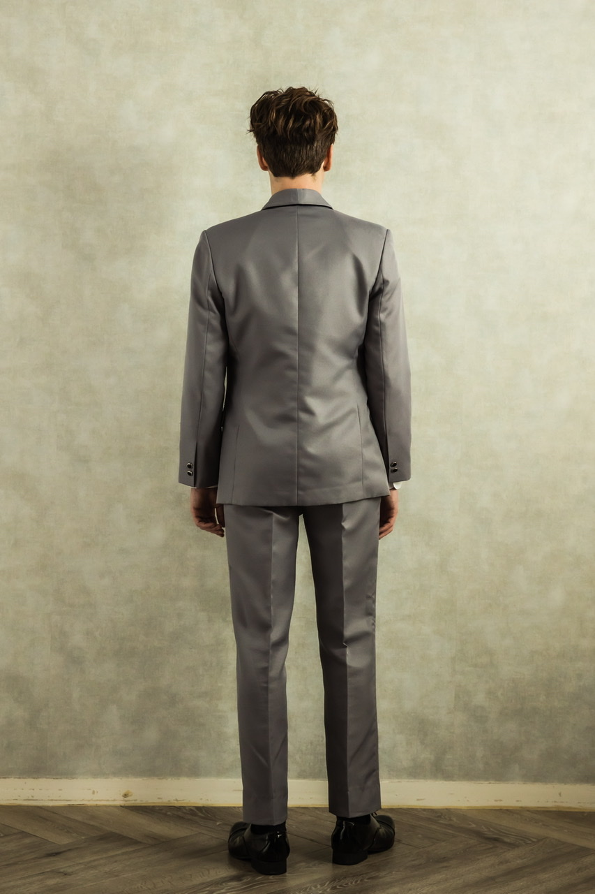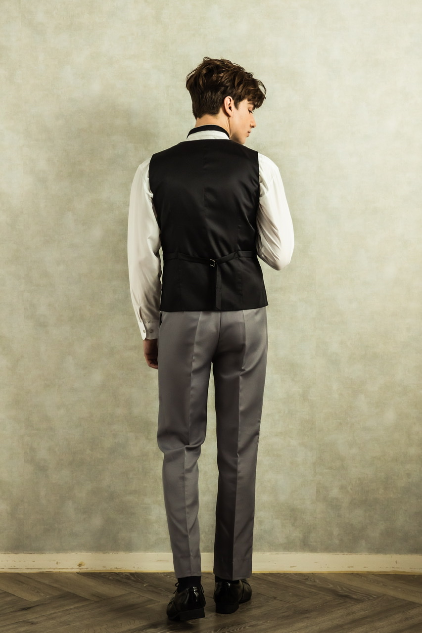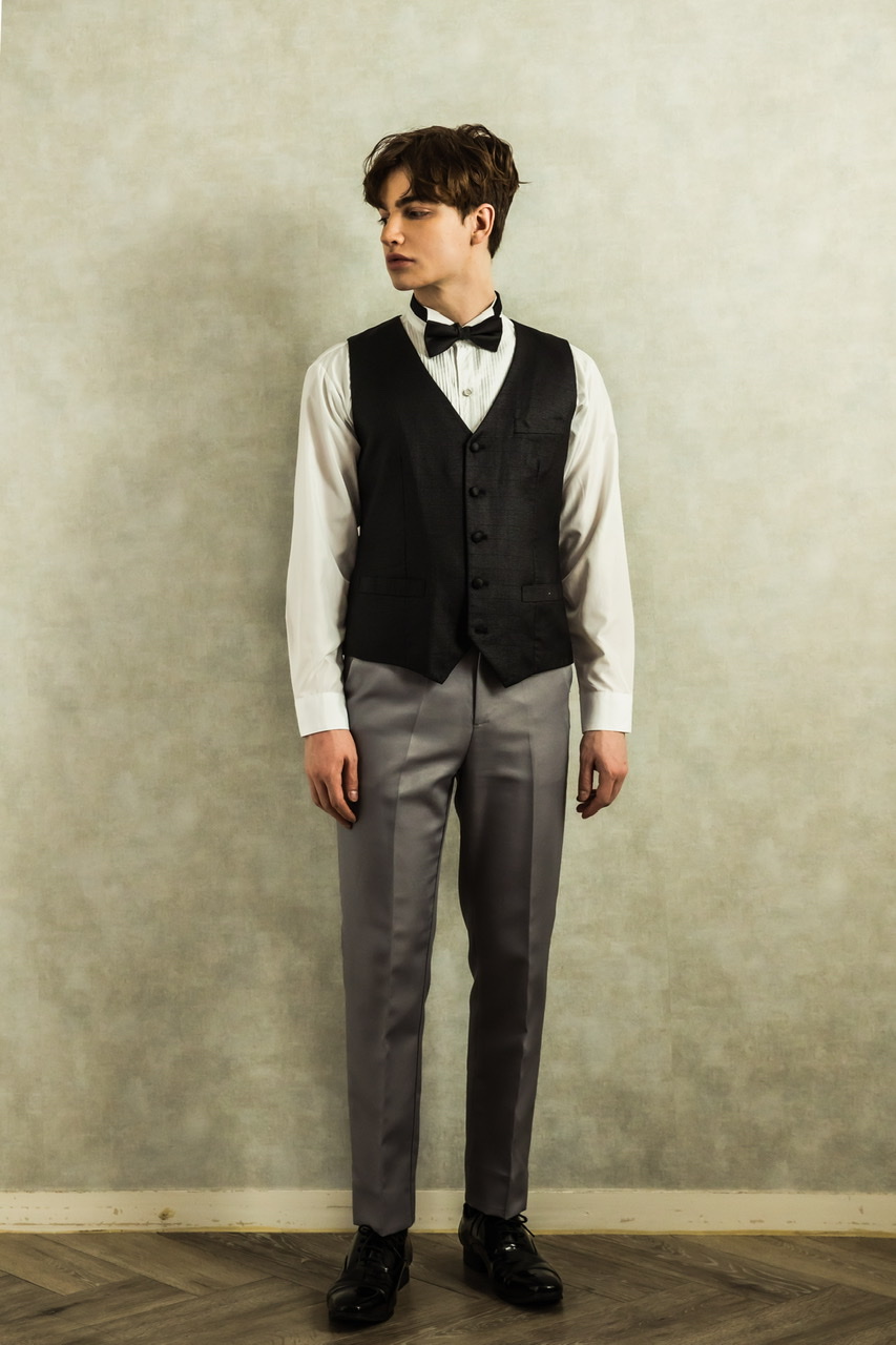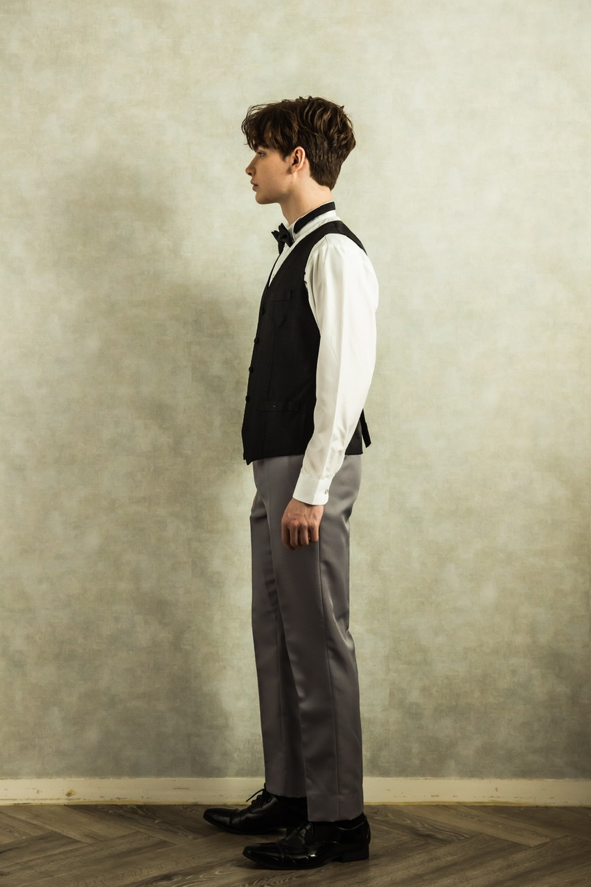 ライトグレーのブラックの細めの黒いパイピングの入ったタキシード。ショール・カラータイプ。。ジャケット、パンツの2ピースタイプ。ベストはシェックやストライプ柄や、スモーキーピンク、ブラック、ブルーなどのベストを差し色として合わせるのもオススメです。合わせるシャツをチェック、ドット、ストライプ、花柄、ネイビー、ブラック、グレーシャツで合わせてカジュアルな二次会タキシードとしても素敵。また白のウィングカラーシャツを合わせればきちんとした結婚式や披露宴向けのフォーマルなコーディネートになります。二次会の披露宴・結婚式・ゲスト結婚式の参列向け。パーティースーツ・二次会・海外ウェディング・フォトウェディング、前撮りにまで幅広いシーンでご使用いただけます。秋冬のシーズンにオススメです。