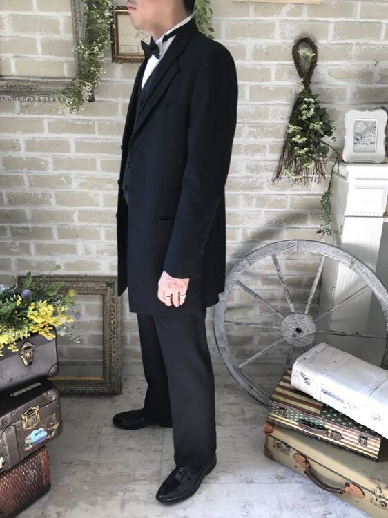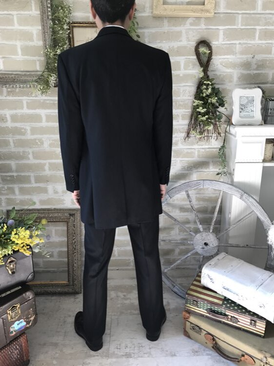 ブラックの昼間の礼装の1つであるフロックコート。下襟の先がとがったピークドラぺルタイプ。ジャケットの前裾が水平にカットされた直線的なシルエットが特徴で、非常に男性的なシルエットです。普段のジャケットスタイルからかけ離れたデザインのため非日常を味わえます。大聖堂の教会式どにおすすsめです。またフロックコートは丈が長いので身長高い方にオススメです。ジャケット、パンツ、ベスト3ピースタイプ。グレー、ワインレッド、シルバー、ゴールド、ベージュカラーのベストを差し色として合わせるのもオススメです。白のウィングカラーシャツを合わせればきちんとした結婚式や披露宴向けのフォーマルなコーディネートになります。披露宴・結婚式・パーテイー・親族の結婚式参列、海外ウェディング・フォトウェディング、前撮りにまで幅広いシーンでご使用いただけます。オールシーズンに適してます。