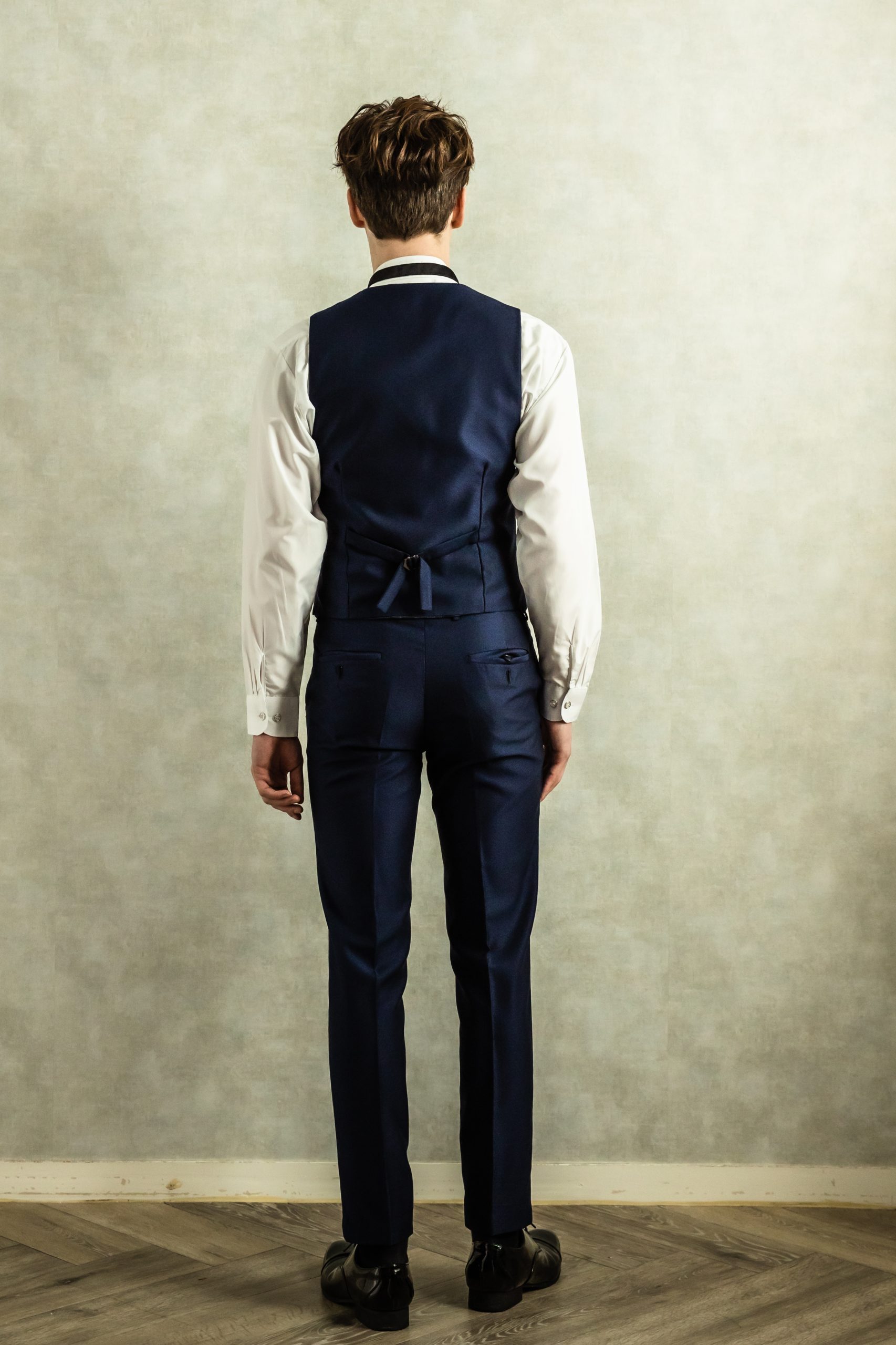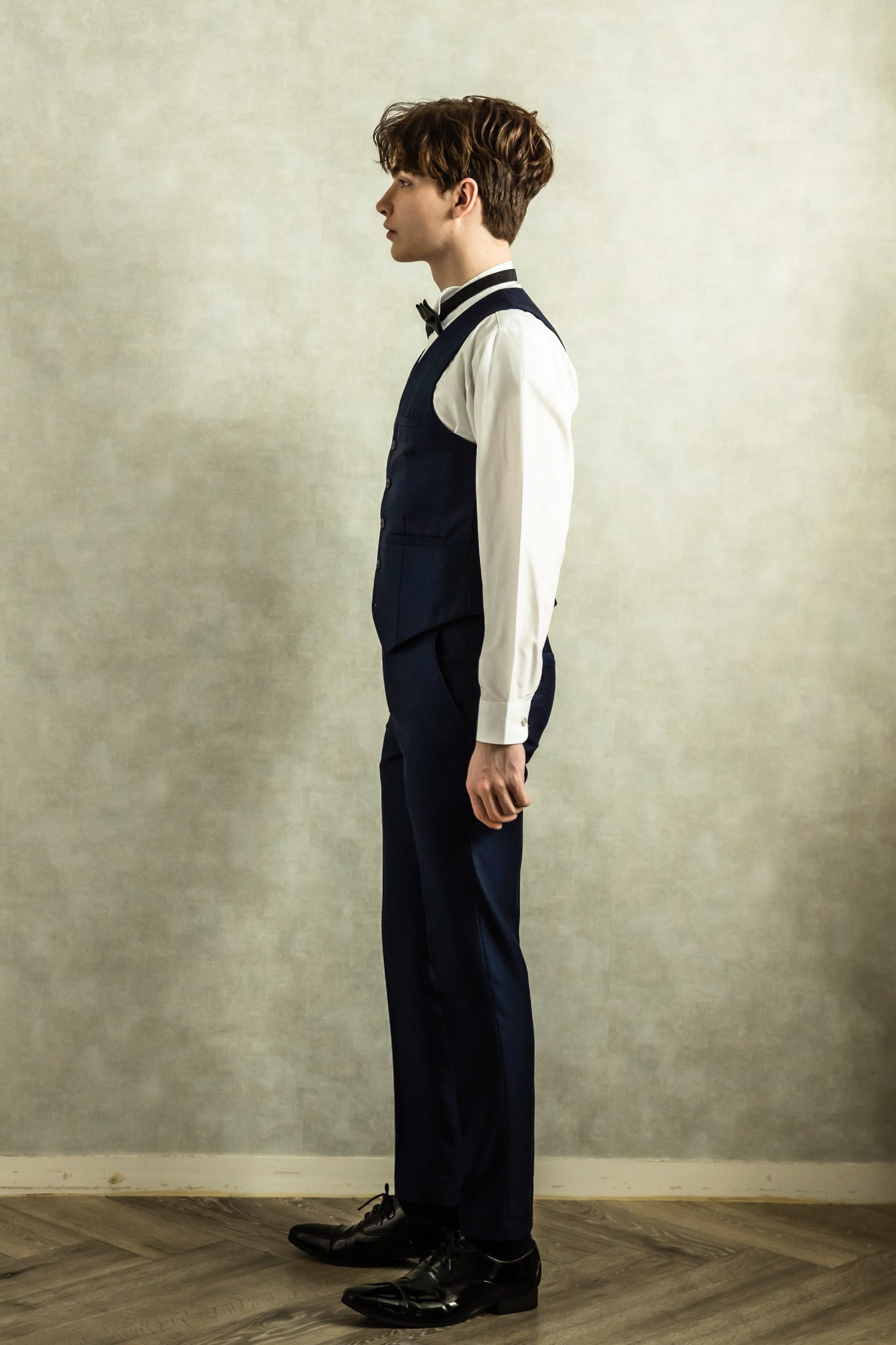 明るめなネイビーブルーのタキシード。濃いめのネイビー色でサテン地のショール・カラータイプ。ジャケット、ベスト、パンツの3ピースで揃えても良い。またベストのみチェック柄や、ワインレッドやグレー、ホワイトカラーなどのベストを差し色として合わせるのもオススメです。パンツを白デニムで合わせてもおしゃれです。合わせるシャツを水色やグレーシャツで合わせてカジュアルな二次会タキシードとしても素敵。また白のウィングカラーシャツを合わせればきちんとした結婚式や披露宴向けのフォーマルなコーディネートになります。二次会の披露宴・結婚式・ゲスト結婚式の参列向け。パーティースーツ・二次会・海外ウェディング・海沿いの会場、リゾートウェディング・フォトウェディング、前撮りにまで幅広いシーンでご使用いただけます