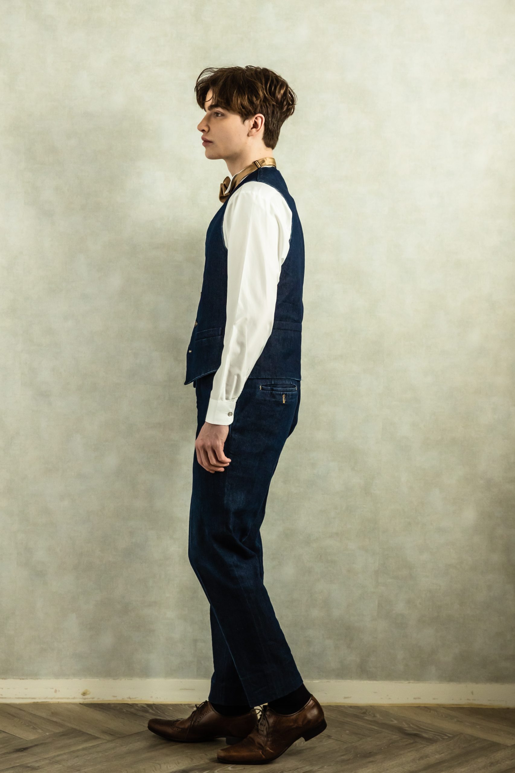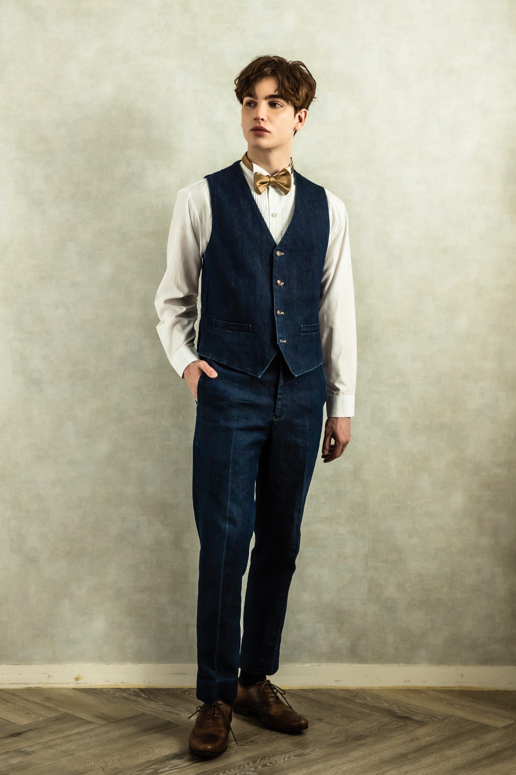 ステッチ入りノンウォッシュデニムのタキシード。ジャケット、ベスト、パンツの3ピースで揃えてもベストのみチャックやカラーベストを差し色として合わせるのもオススメです。パンツを白デニムで合わせてもおしゃれです。合わせるシャツを水色ネイビーのチェックシャツで合わせてカジュアルな二次会タキシードとしても素敵。また白のウィングカラーシャツを合わせればきちんとして爽やかなコーディネートになります。二次会の披露宴・結婚式・ゲスト結婚式の参列向け。パーティースーツ・二次会・海外ウェディング・海沿いの会場、リゾートウェディング・フォトウェディング、前撮りにまで幅広いシーンでご使用いただけます