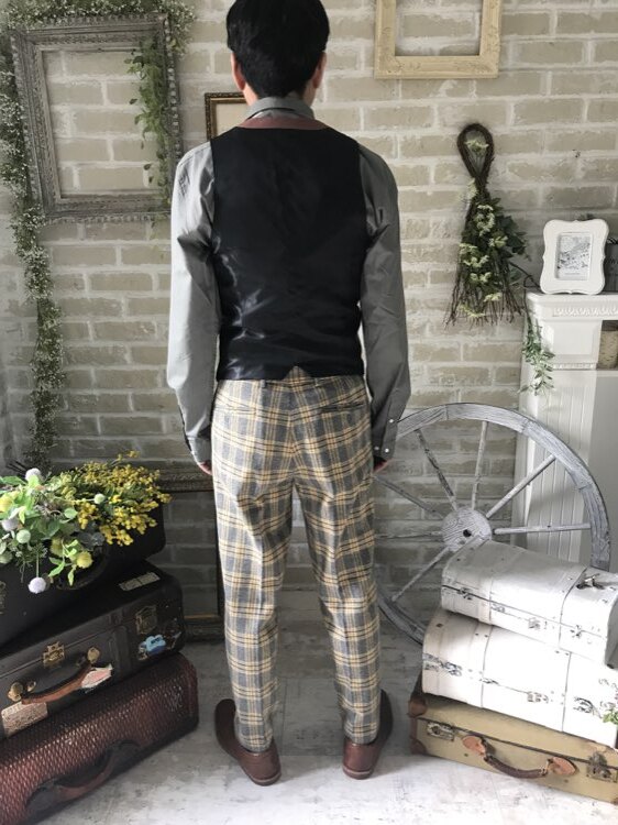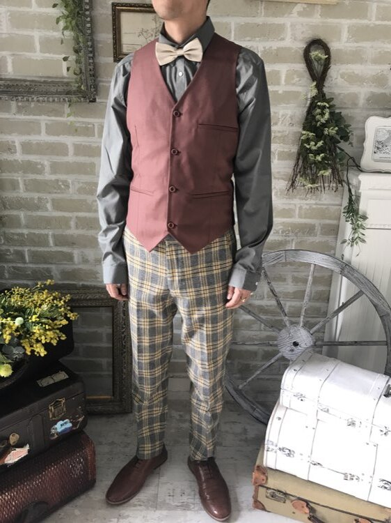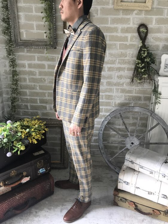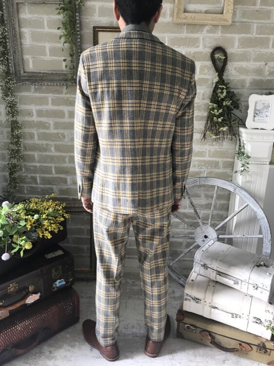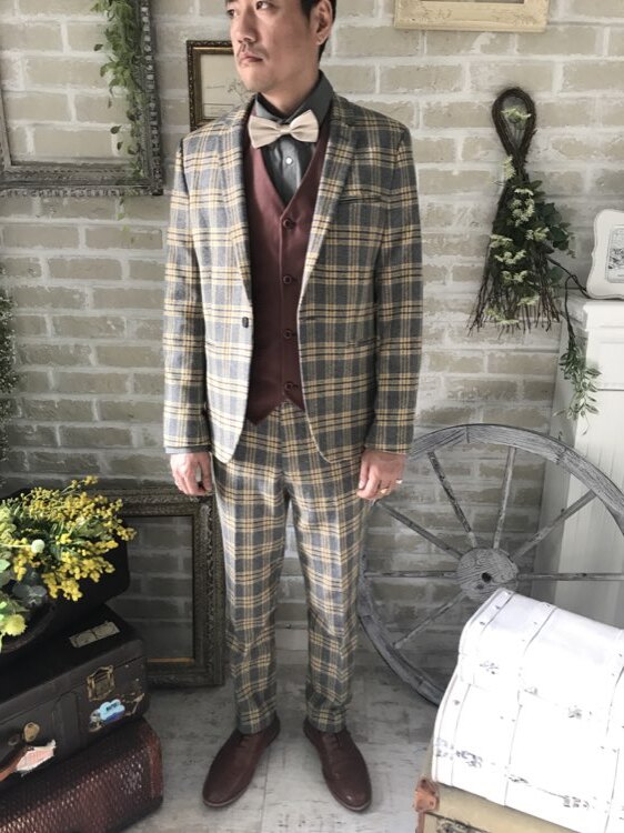 光沢のないチェックのカジュアルなスーツ・タキシード。センタープリーツ入りパンツはふと過ぎないストレートなシルエットです。下襟の先がとがったピークドラぺルタイプ。ジャケット、パンツ・ベストの3ピースタイプ。ベストはチェックやストライプ柄や、スモーキーピンク、ブラック、ブルーなどのベストを差し色として合わせるのもオススメです。合わせるシャツをチェック、ドット、ストライプ、花柄、ネイビー、ブラック、グレーシャツで合わせてカジュアルな二次会タキシードとしても素敵。また白のウィングカラーシャツを合わせればきちんとした結婚式や披露宴向けのフォーマルなコーディネートになります。披露宴・結婚式・ゲスト結婚式の参列向け。パーティースーツ・二次会・海外ウェディング・フォトウェディング、前撮りにまで幅広いシーンでご使用いただけます。秋・冬にオススメです。