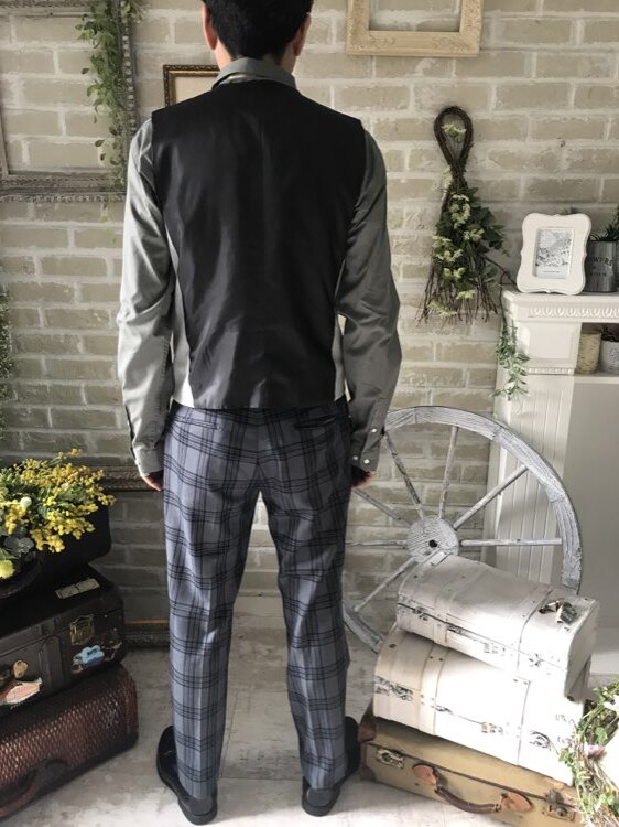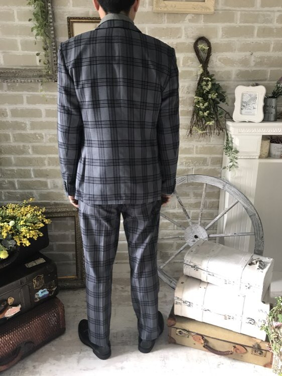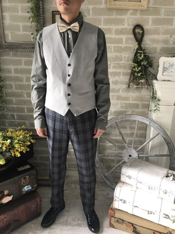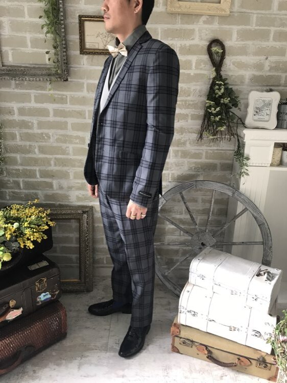 光沢のないチェックのカジュアルなスーツ・タキシード。センタープリーツ入りパンツはふと過ぎないストレートなシルエットです。下襟の先がとがったピークドラぺルタイプ。ジャケット、パンツの2ピースタイプ。ベストはチェックやストライプ柄や、スモーキーピンク、ブラック、ブルーなどのベストを差し色として合わせるのもオススメです。合わせるシャツをチェック、ドット、ストライプ、花柄、ネイビー、ブラック、グレーシャツで合わせてカジュアルな二次会タキシードとしても素敵。また白のウィングカラーシャツを合わせればきちんとした結婚式や披露宴向けのフォーマルなコーディネートになります。披露宴・結婚式・ゲスト結婚式の参列向け。パーティースーツ・二次会・海外ウェディング・フォトウェディング、前撮りにまで幅広いシーンでご使用いただけます。オールシーズンに適しています。