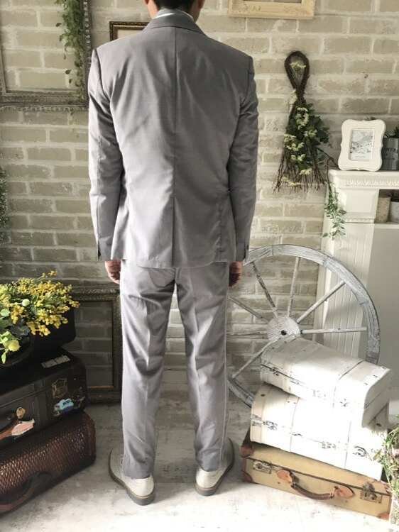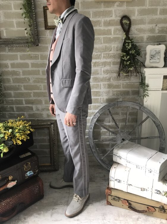 光沢のないグレーのカジュアルなスーツ・タキシード。センタープリーツ入りパンツはふと過ぎないストレートなシルエットです。下襟の先がとがったピークドラぺルタイプ。ジャケット、パンツの2ピースタイプ。ベストはチェックやストライプ柄や、スモーキーピンク、ブラック、ブルーなどのベストを差し色として合わせるのもオススメです。合わせるシャツをチェック、ドット、ストライプ、花柄、ネイビー、ブラック、グレーシャツで合わせてカジュアルな二次会タキシードとしても素敵。また白のウィングカラーシャツを合わせればきちんとした結婚式や披露宴向けのフォーマルなコーディネートになります。披露宴・結婚式・ゲスト結婚式の参列向け。パーティースーツ・二次会・海外ウェディング・フォトウェディング、前撮りにまで幅広いシーンでご使用いただけます。秋~春にオススメ。