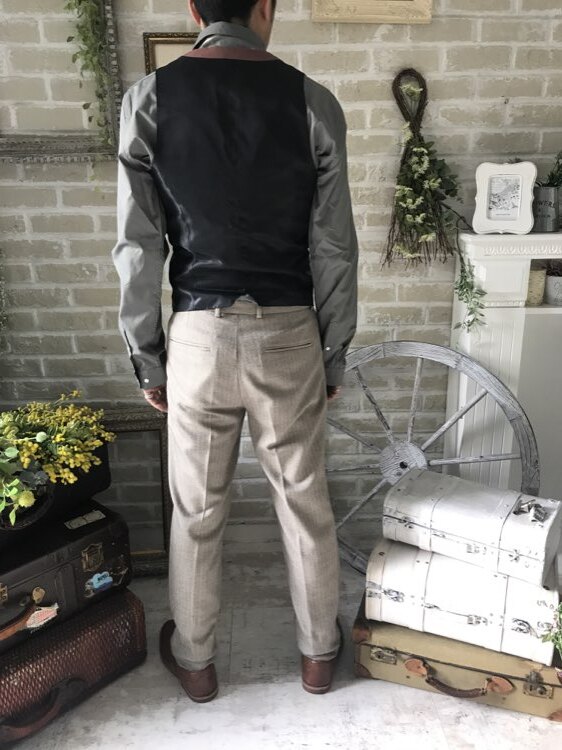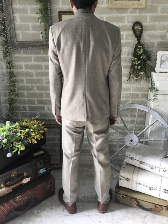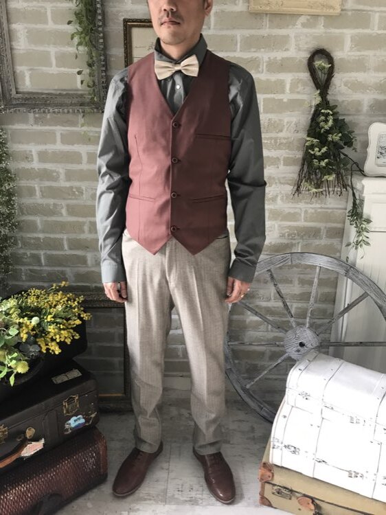 光沢のないベージュカラーのカジュアルなスーツ・タキシード。センタープリーツ入りパンツはふと過ぎないストレートなシルエットです。下襟の先がとがったピークドラぺルタイプ。ジャケット、パンツの2ピースタイプ。ベストはチェックやストライプ柄や、スモーキーピンク、ブラック、ブルーなどのベストを差し色として合わせるのもオススメです。合わせるシャツをチェック、ドット、ストライプ、花柄、ネイビー、ブラック、グレーシャツで合わせてカジュアルな二次会タキシードとしても素敵。また白のウィングカラーシャツを合わせればきちんとした結婚式や披露宴向けのフォーマルなコーディネートになります。披露宴・結婚式・ゲスト結婚式の参列向け。パーティースーツ・二次会・海外ウェディング・フォトウェディング、前撮りにまで幅広いシーンでご使用いただけます。秋~春にオススメ。
