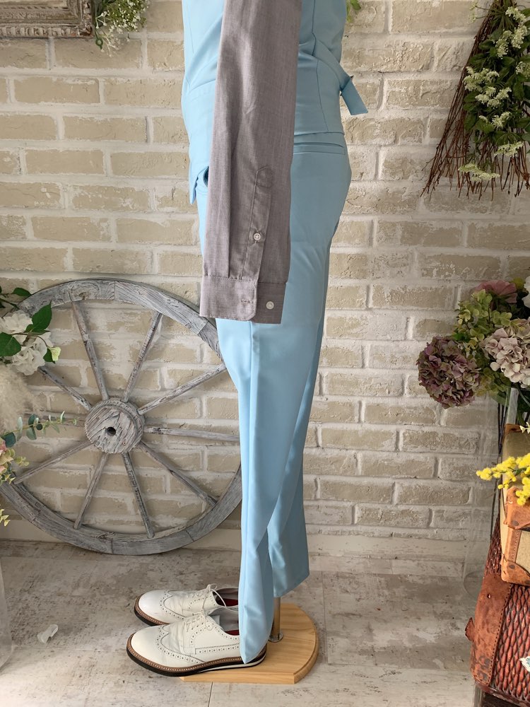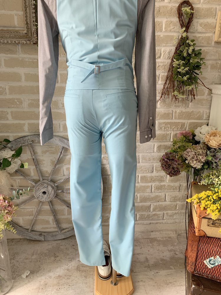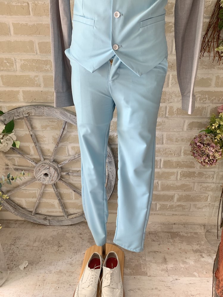 光沢のないライトブルーのカジュアルなスーツ・タキシード。センタープリーツ入りパンツはふと過ぎないストレートなシルエットです。下襟の先がとがったピークドラぺルタイプ。ジャケット、パンツ・ベストの3ピースタイプ。ベストはチェックやストライプ柄や、スモーキーピンク、ブラック、ブルーなどのベストを差し色として合わせるのもオススメです。合わせるシャツをチェック、ドット、ストライプ、花柄、ネイビー、ブラック、グレーシャツで合わせてカジュアルな二次会タキシードとしても素敵。また白のウィングカラーシャツを合わせればきちんとした結婚式や披露宴向けのフォーマルなコーディネートになります。披露宴・結婚式・ゲスト結婚式の参列向け。パーティースーツ・二次会・海外ウェディング・フォトウェディング、前撮りにまで幅広いシーンでご使用いただけます。オールシーズンに適しています。