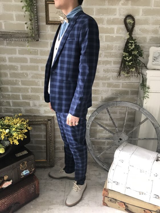光沢のないチェックのカジュアルなスーツ・タキシード。センタープリーツ入りパンツはふと過ぎないストレートなシルエットです。下襟の先がとがったピークドラぺルタイプ。ジャケット、パンツ・ベストの3ピースタイプ。ベストはチェックやストライプ柄や、スモーキーピンク、ブラック、ブルーなどのベストを差し色として合わせるのもオススメです。合わせるシャツをチェック、ドット、ストライプ、花柄、ネイビー、ブラック、グレーシャツで合わせてカジュアルな二次会タキシードとしても素敵。また白のウィングカラーシャツを合わせればきちんとした結婚式や披露宴向けのフォーマルなコーディネートになります。披露宴・結婚式・ゲスト結婚式の参列向け。パーティースーツ・二次会・海外ウェディング・フォトウェディング、前撮りにまで幅広いシーンでご使用いただけます。オールシーズンに適しています。
