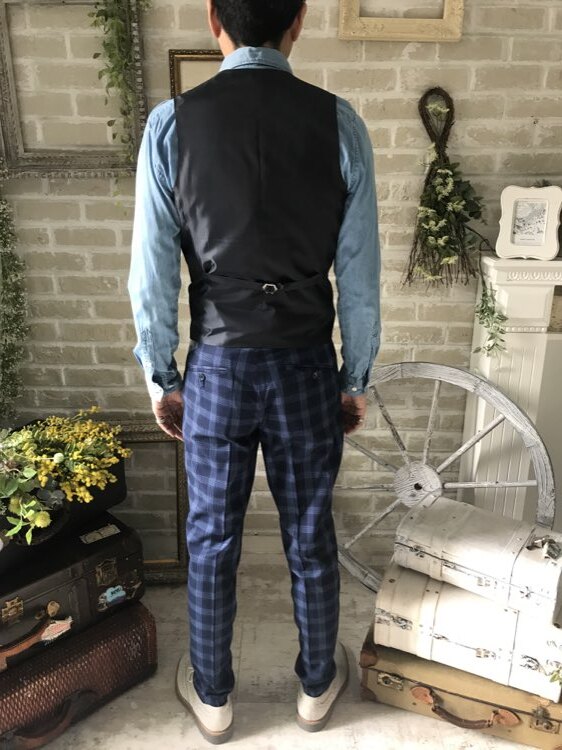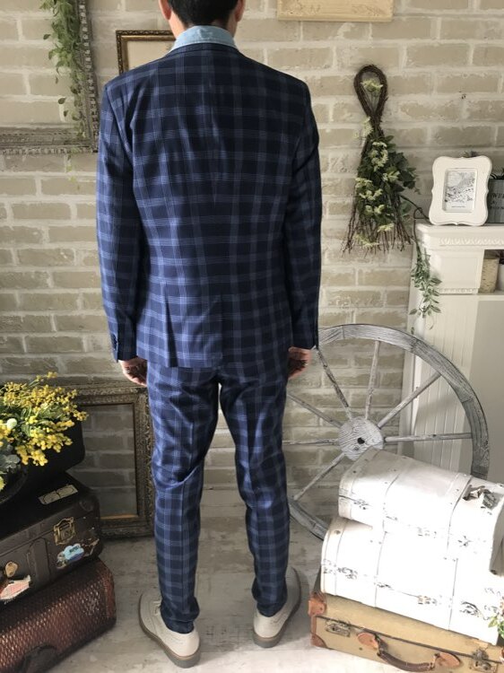 光沢のないチェックのカジュアルなスーツ・タキシード。センタープリーツ入りパンツはふと過ぎないストレートなシルエットです。下襟の先がとがったピークドラぺルタイプ。ジャケット、パンツ・ベストの3ピースタイプ。ベストはチェックやストライプ柄や、スモーキーピンク、ブラック、ブルーなどのベストを差し色として合わせるのもオススメです。合わせるシャツをチェック、ドット、ストライプ、花柄、ネイビー、ブラック、グレーシャツで合わせてカジュアルな二次会タキシードとしても素敵。また白のウィングカラーシャツを合わせればきちんとした結婚式や披露宴向けのフォーマルなコーディネートになります。披露宴・結婚式・ゲスト結婚式の参列向け。パーティースーツ・二次会・海外ウェディング・フォトウェディング、前撮りにまで幅広いシーンでご使用いただけます。オールシーズンに適しています。
