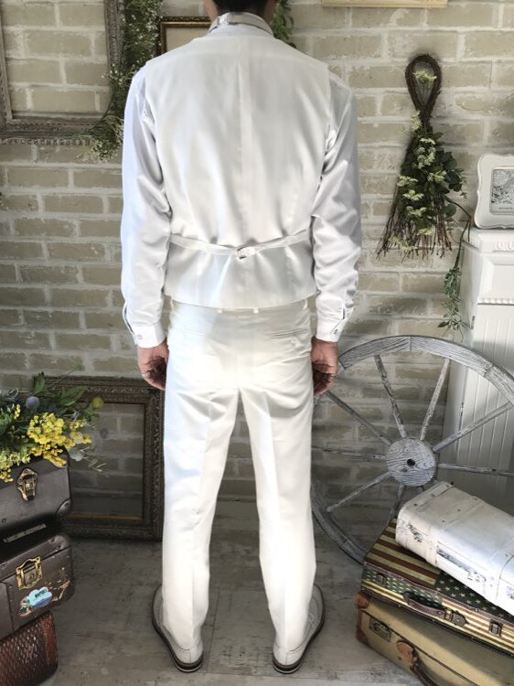 ホワイト。アイボリー(白)の光沢のあるタキシード。センタープリーツ入りパンツはふと過ぎないストレートなシルエットです。下襟の先がとがったピークドラぺルタイプ。ジャケット、パンツの、ベストのピースタイプ。ベストはチェックやストライプ柄や、スモーキーピンク、ブラック、ブルーなどのベストを差し色として合わせるのもオススメです。合わせるシャツをチェック、ドット、ストライプ、花柄、ネイビー、ブラック、グレーシャツで合わせてカジュアルな二次会タキシードとしても素敵。また白のウィングカラーシャツを合わせればきちんとした結婚式や披露宴向けのフォーマルなコーディネートになります。披露宴・結婚式・パーティースーツ・二次会・海外ウェディング・フォトウェディング、前撮りにまで幅広いシーンでご使用いただけます。オールシーズンに適してます。
