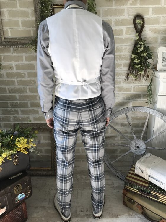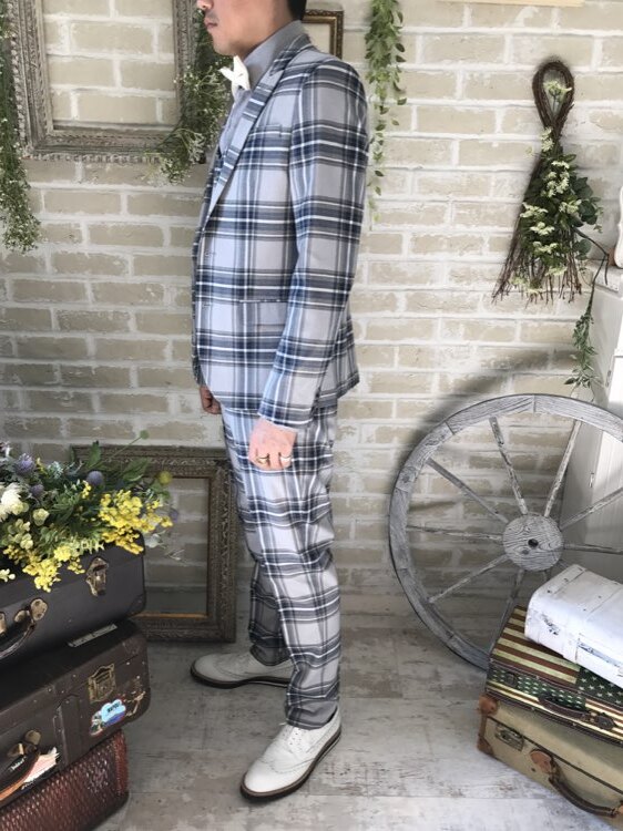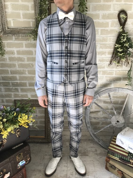 光沢のないチェックのカジュアルなスーツ・タキシード。センタープリーツ入りパンツはふと過ぎないストレートなシルエットです。下襟の先がとがったピークドラぺルタイプ。ジャケット、パンツ・ベストの3ピースタイプ。ベストはチェックやストライプ柄や、スモーキーピンク、ブラック、ブルーなどのベストを差し色として合わせるのもオススメです。合わせるシャツをチェック、ドット、ストライプ、花柄、ネイビー、ブラック、グレーシャツで合わせてカジュアルな二次会タキシードとしても素敵。また白のウィングカラーシャツを合わせればきちんとした結婚式や披露宴向けのフォーマルなコーディネートになります。披露宴・結婚式・ゲスト結婚式の参列向け。パーティースーツ・二次会・海外ウェディング・フォトウェディング、前撮りにまで幅広いシーンでご使用いただけます。オールシーズンに適しています。